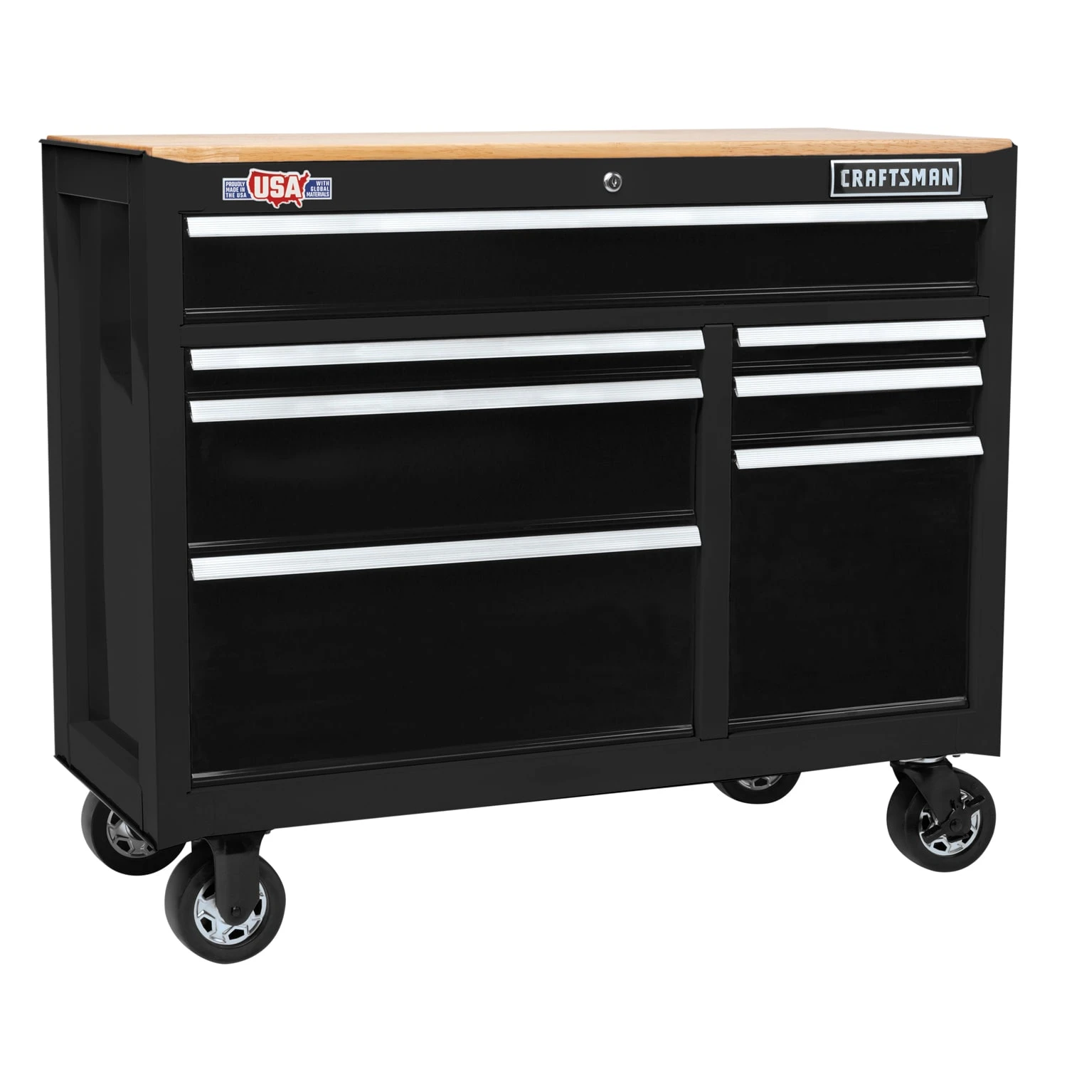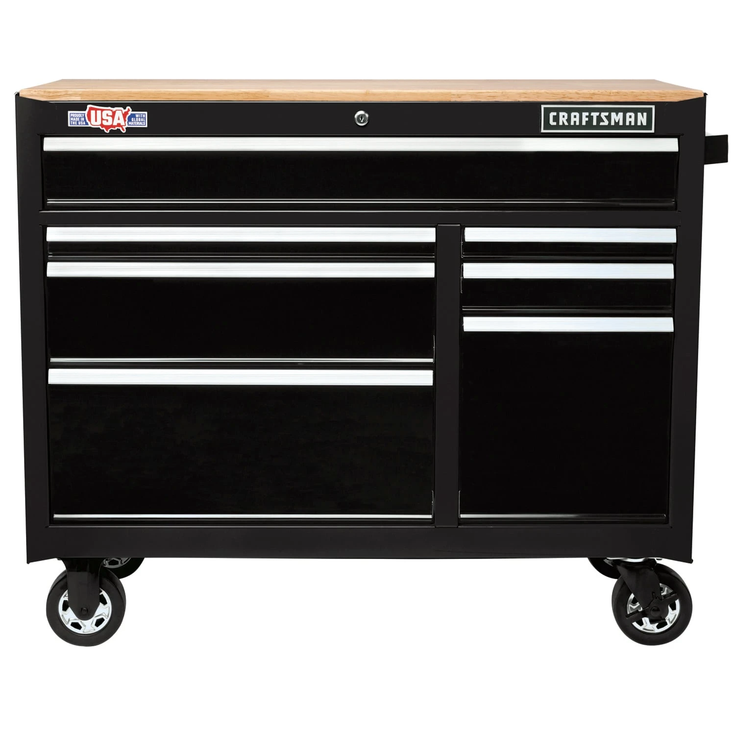Our CRAFTSMAN® 41-in wide mobile workbench combines a solid butcher block work surface with a rolling tool cabinet. Seven drawers with ball-bearing slides open easily and close gently without slamming, even with 100-lbs of tools. The removable solid wood work surface is sealed for easy cleanup. The entire workbench, rolling tool chest combo can be moved easily on 5-in x 2-in casters, and a keyed locking system safeguards the contents of the rolling tool chest.