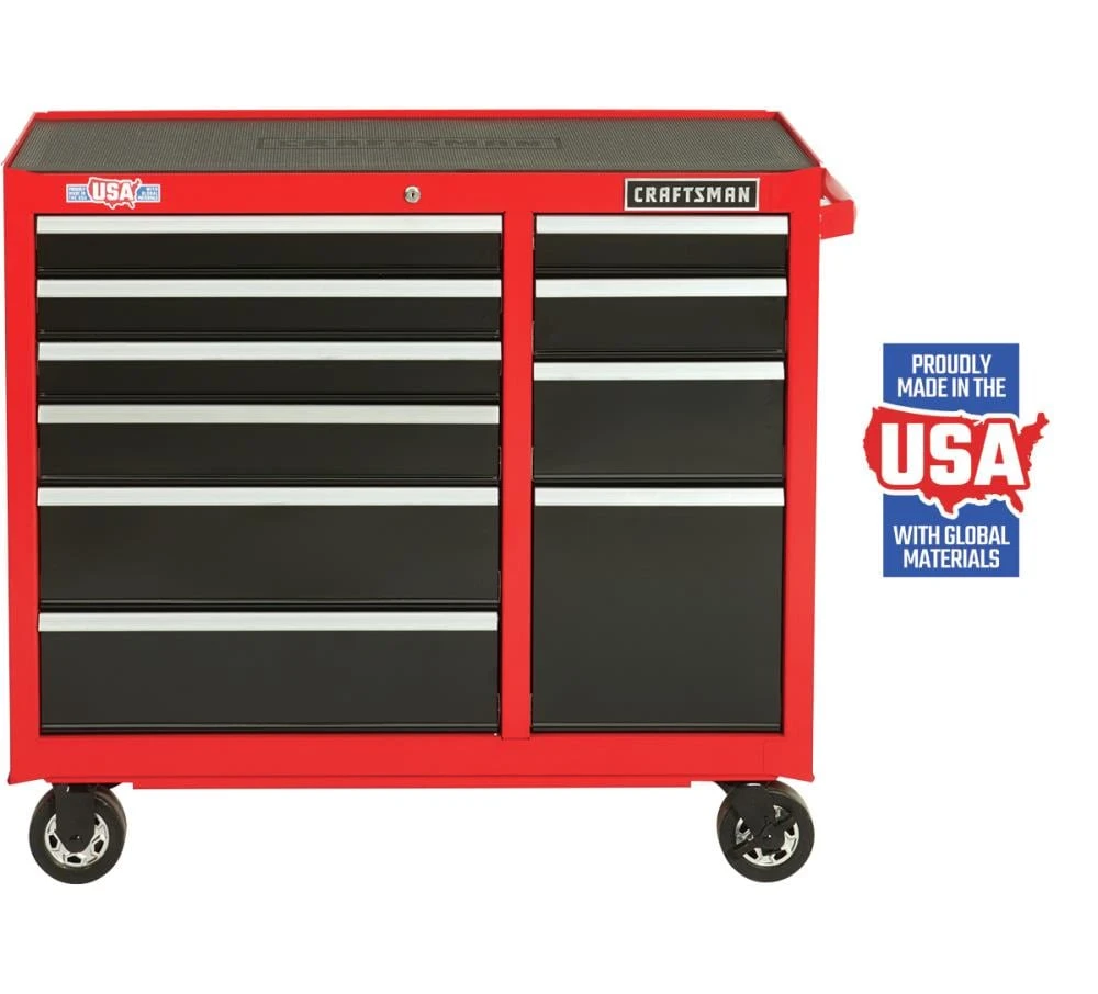 Proudly Made in the USA with Global Materials in Sedalia, Missouri. The 2000 Series 41-in Wide 10 Drawer Rolling Tool Cabinet utilizes an all steel I-Frame® Double Wall Construction. Each drawer can support 100-lbs and features heavy-duty soft close drawer slides that gently pull themselves shut without slamming.