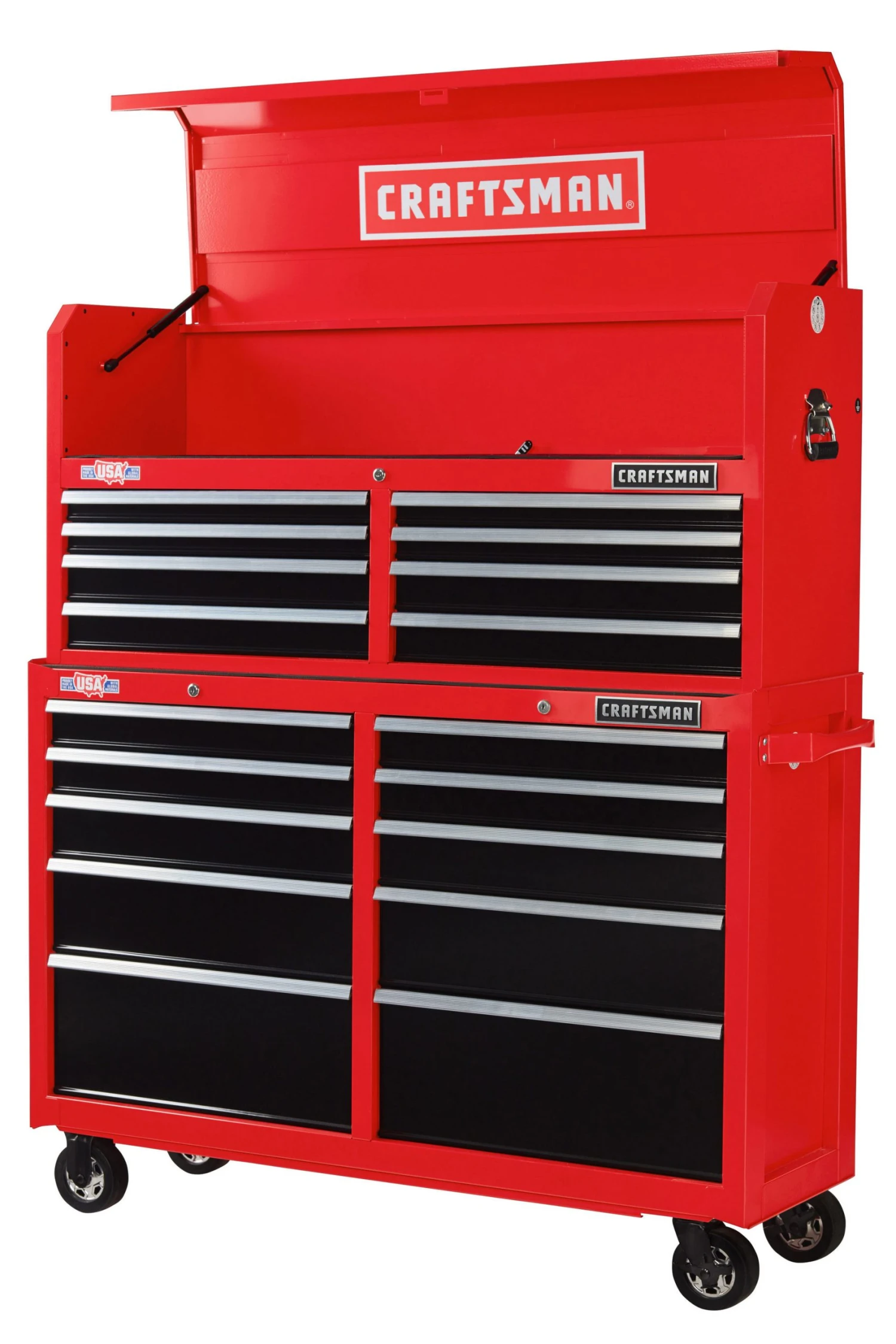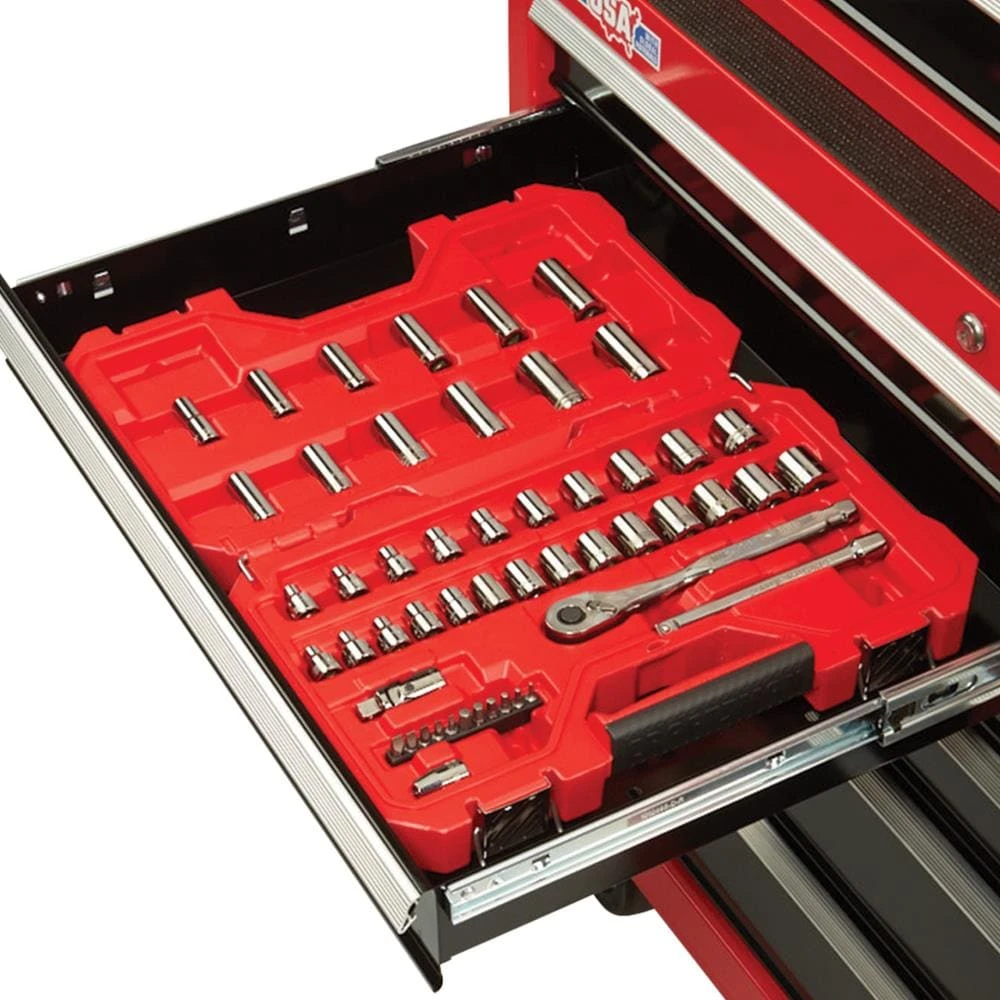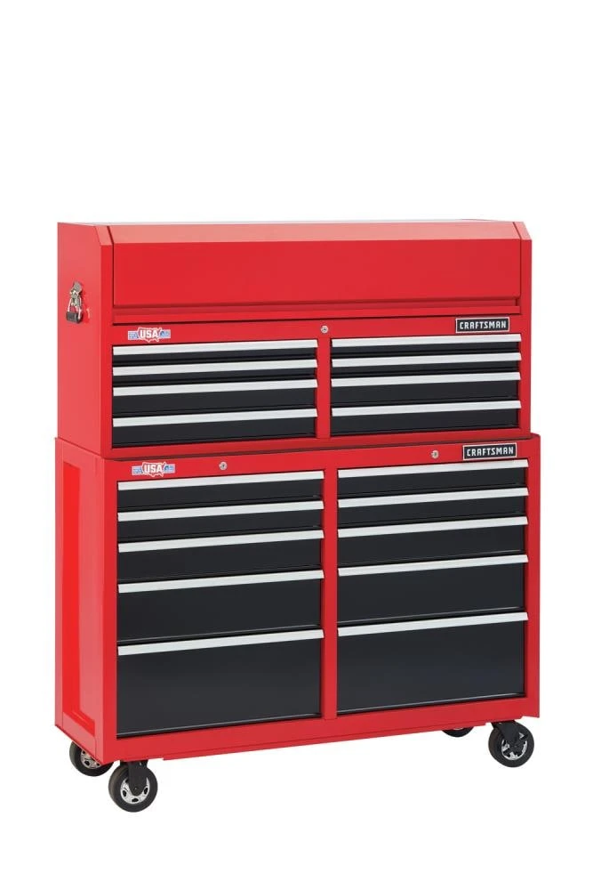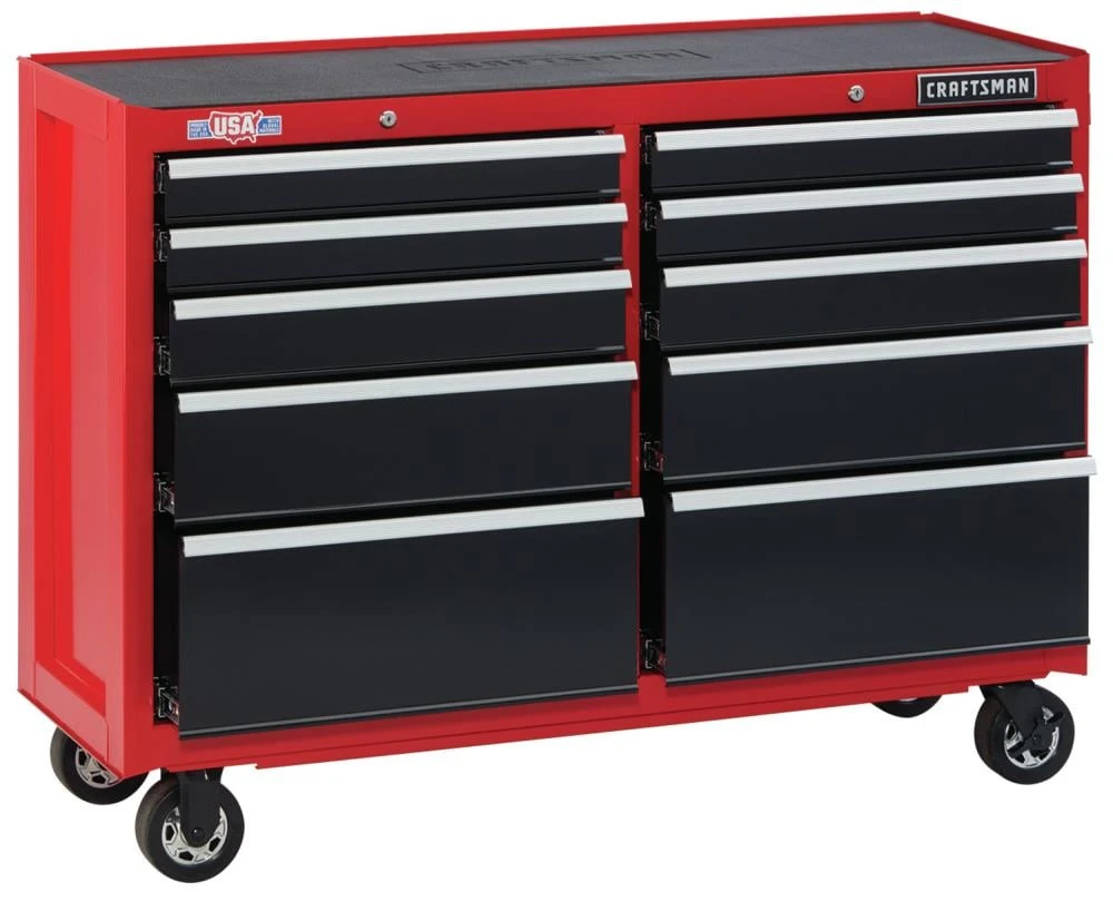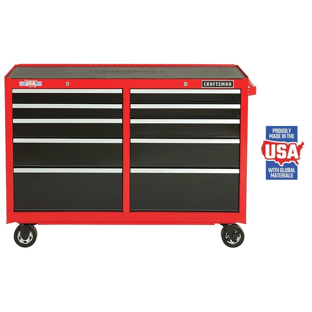 Proudly Made in the USA with Global Materials this 2000 Series 52-in Wide 10 Drawer Rolling Tool Cabinet can support 100-lbs and features heavy-duty soft close drawer slides that gently pull themselves shut without slamming. Combine this metal tool cabinet with the matching tool chest, and you’ll have the ultimate tool organizer.