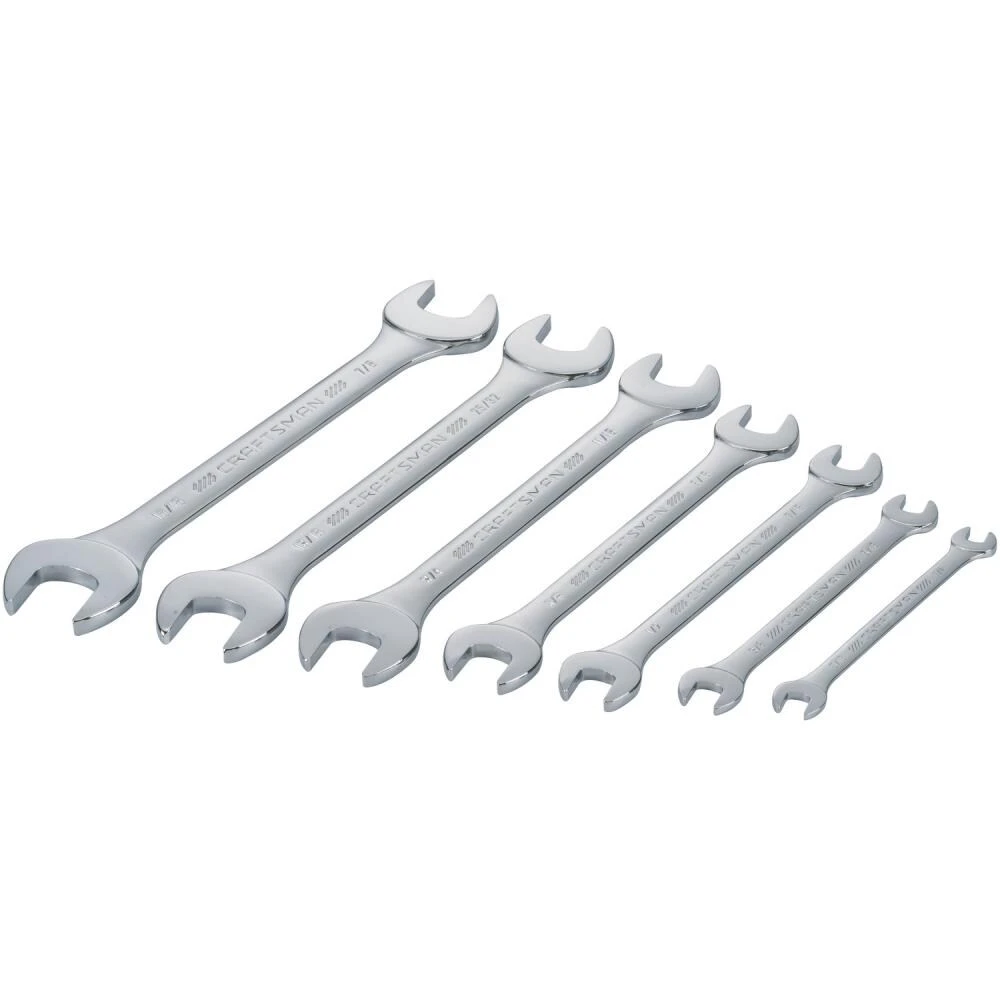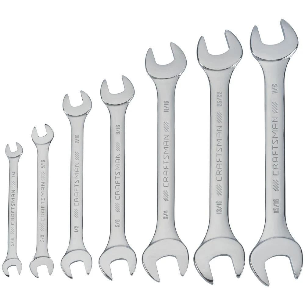 The CRAFTSMAN® 7-piece open-end wrench set provides durability and versatility. From plumbing to weekend projects this set has you covered, featuring two open-end wrench sizes on each piece, including 1/4 x 5/16, 5/16 x 3/8, 7/16 x 1/2, 9/16 x 5/8, 11/16 x 3/4, 25/32 x 13/16, 7/8 x 15/16-in. You’ll appreciate the unmatched grip and solid durability of this tool set. The varying handle lengths are based on the size of the wrench and designed to provide a comfortable grip and optimum amount of torque to break loose or tighten stubborn pipes, nuts and bolts.