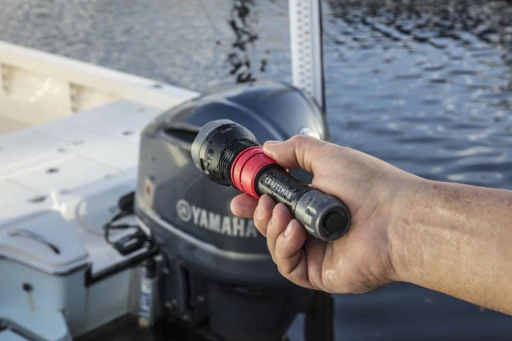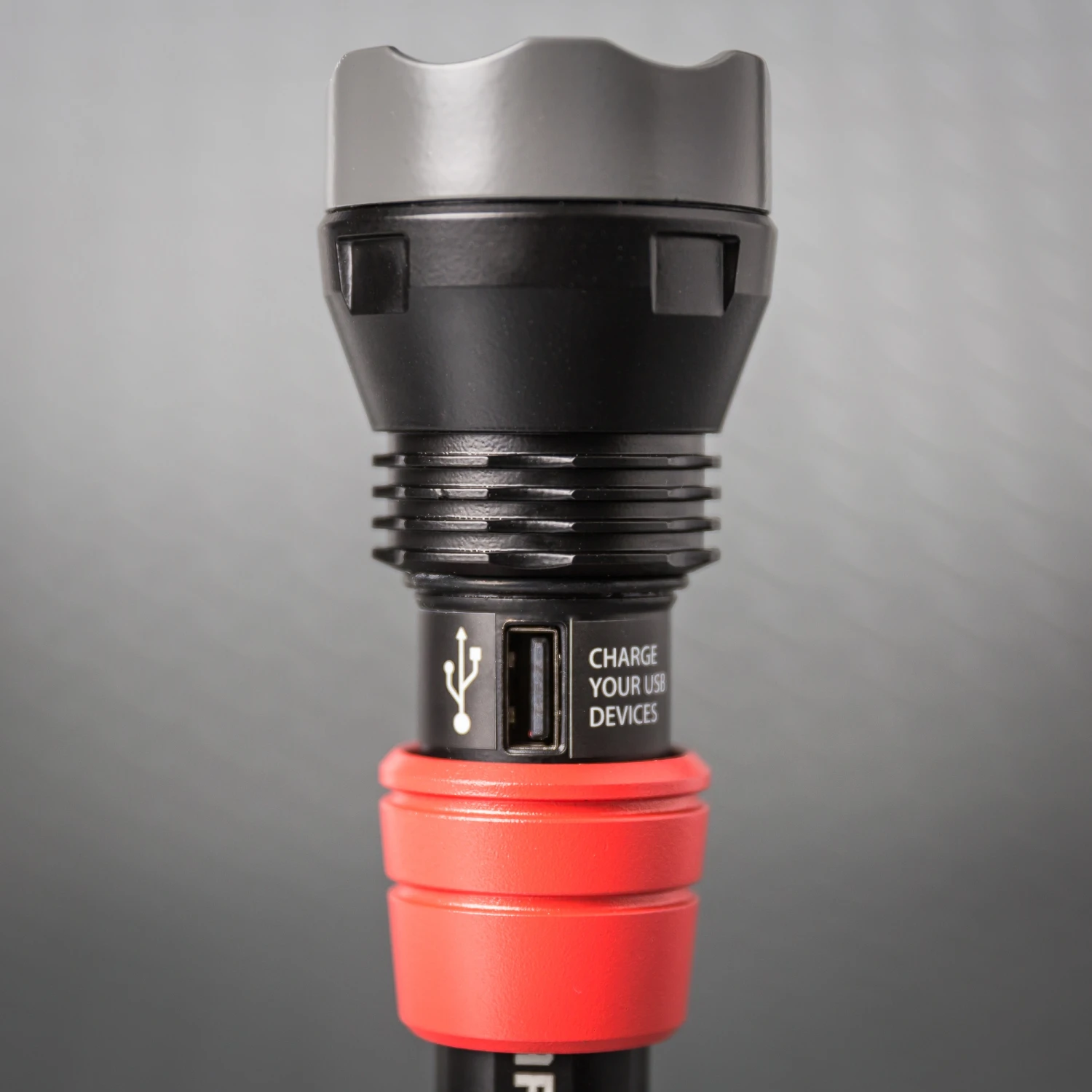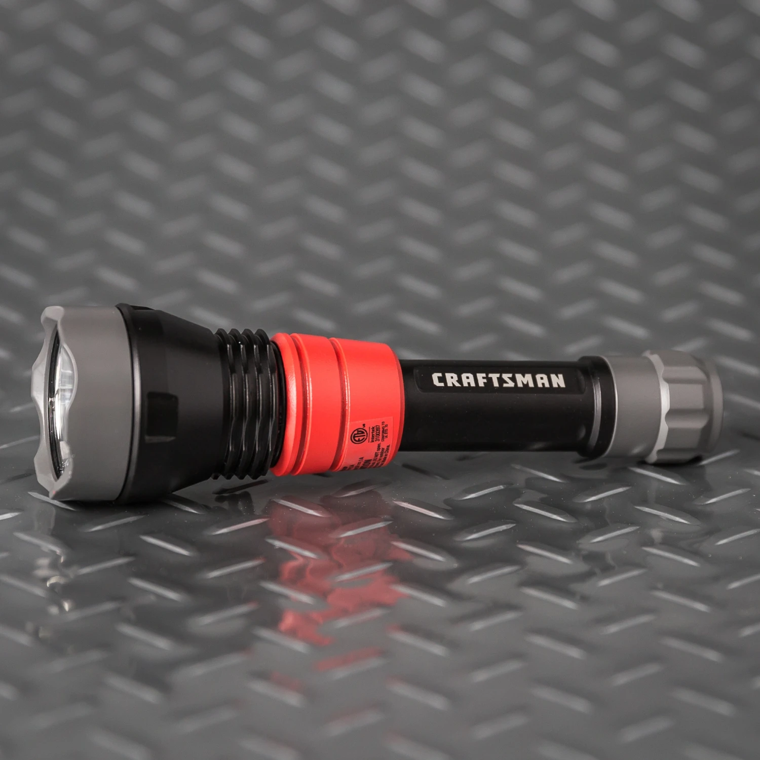 Get the perfect mix of performance and utility, all in a handheld package with the 500 lm rechargeable flashlight from Craftsman. Featuring a rugged, waterproof aluminum housing that’s drop safe and submersible up to six feet, it’s perfect for almost any job indoors or outdoors, from the garage to the work site to the marina. The ultra-bright LED can be seen from over 1,230 Ft. away and provides a long-lasting charge of almost 10 hours on low (or 3 hours on high). Unscrew the middle cover and you’ll find a 2-way USB charging port that can power up your personal electronic devices on-the-go, or recharge your flashlight from practically any compatible power source. The lithium ion battery can hold a charge for up to 12 months and still help you light the way.