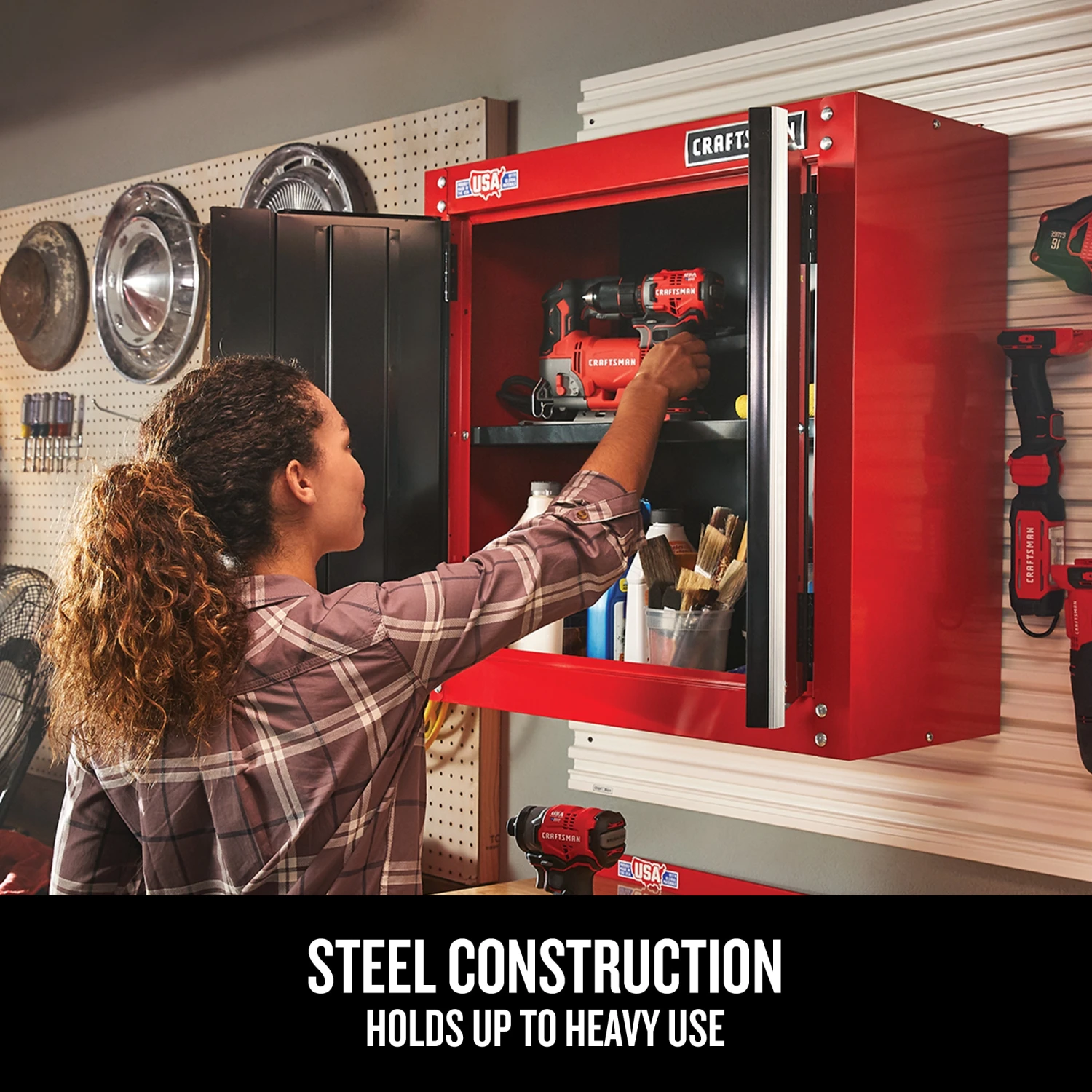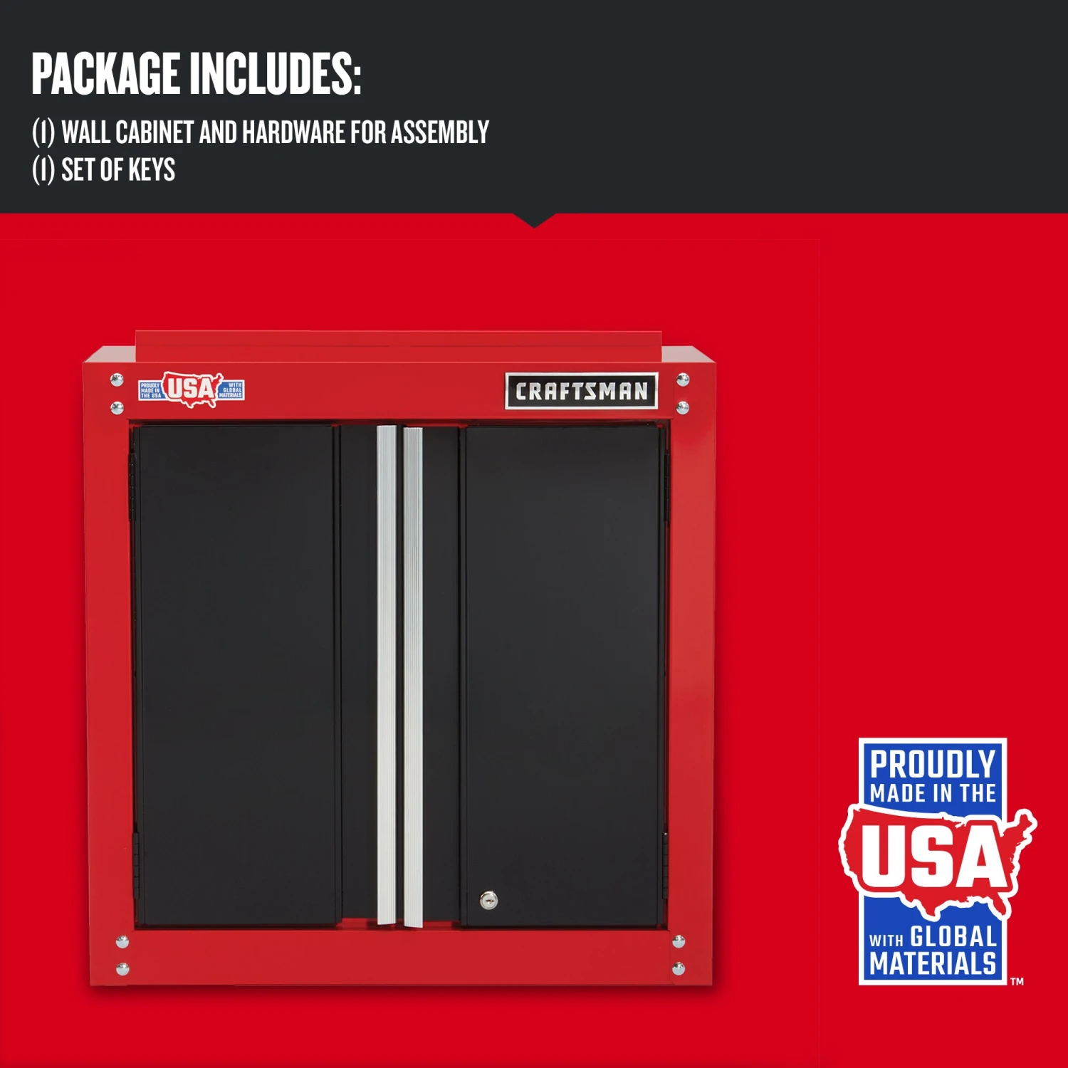 Proudly made in the USA with global materials in Sedalia, Missouri. The CRAFTSMAN Garage Wall Cabinet for tool storage keeps tools off the ground so that you can quickly and easily locate the tool you need and save floor space. The cabinet offers a strong and durable garage organization solution to store power tools, hand tools, sockets, wrenches, and bit sets, and more.