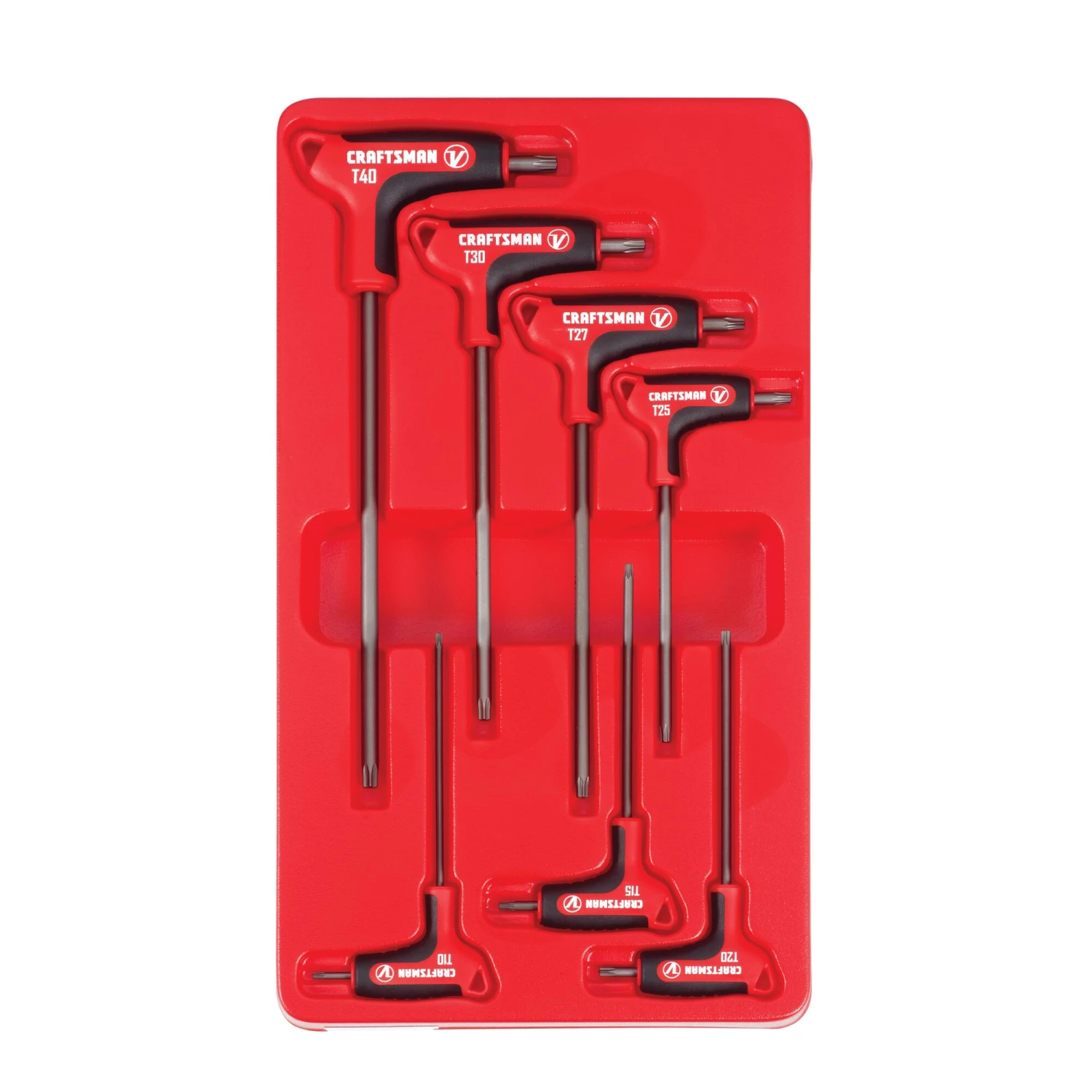 With patented X-Tract™ Technology, removing rounded or rusted fasteners just got easier. The Craftsman® V-Series 7pc X-Tract™ Torx® T-Handle Set is designed to remove fasteners up to 50% rounded, while also helping to prevent rounding or stripping of new fasteners. The X-Tract™ grooves in the tip create additional engagement points for gripping and help to release stress on the interior of the fastener as you turn. Each key is also manufactured from premium S2 steel for strength and durability, with an ergonomic, over-molded handle for additional grip in high torque applications.