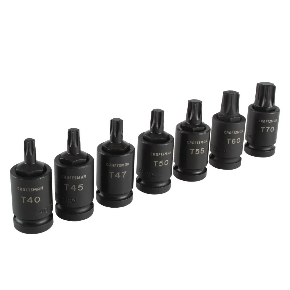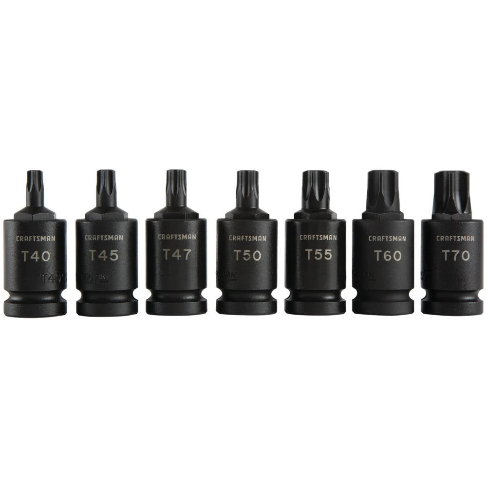 - Includes (7) 1/2-in Drive Torx Impact Bit Sockets (T40, T45, T47, T50, T55, T60, T70)