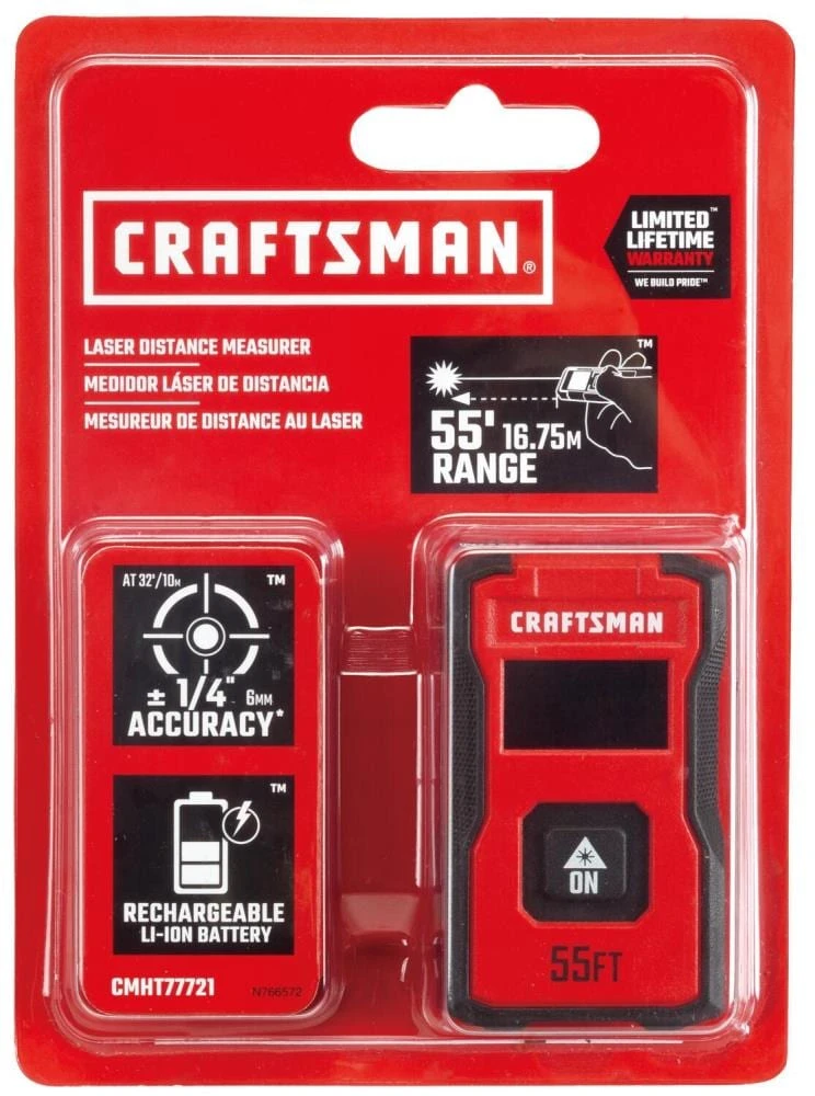 With its slim and compact design, you’ll be able to pocket this CRAFTSMAN 55 ft. Pocket Laser Distance Measurer and take it wherever you need it. One-button operation makes it easy to use and lets you quickly change between units of measure. Equipped with a convenient rechargeable battery, the backlit LCD screen clearly displays measurements as you take them. The CRAFTSMAN 55 ft. Pocket Laser Distance Measurer is suitable for use in a wide range of applications from electrical and plumbing to basic home measurements, making it a great addition to your CRAFTSMAN lineup.