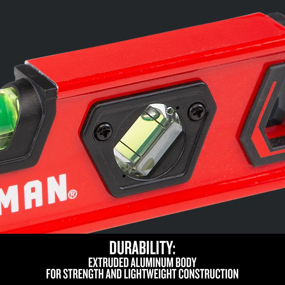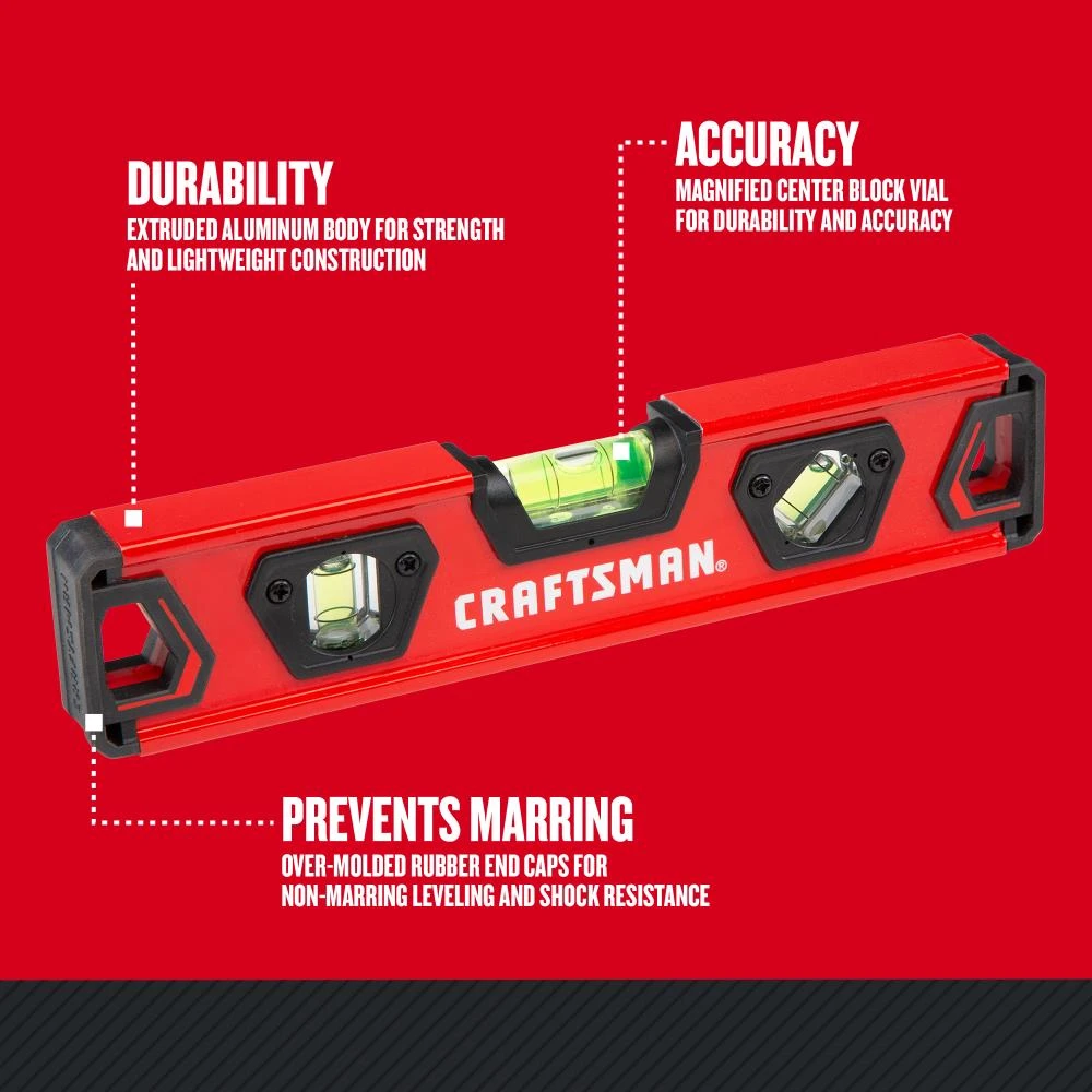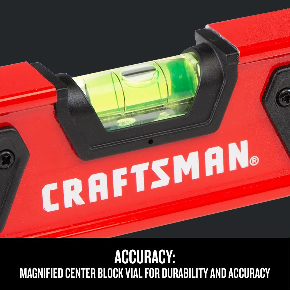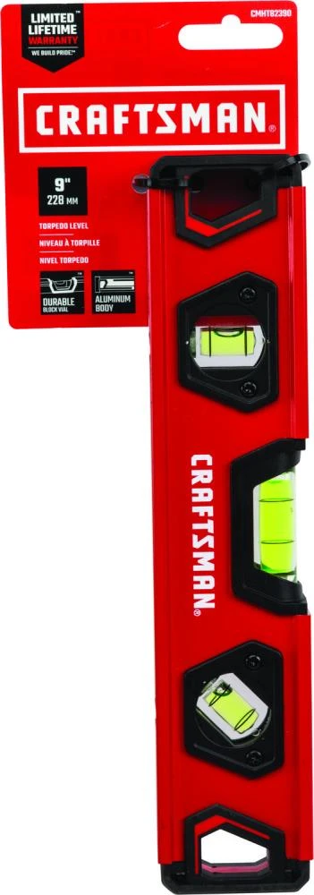 Get all your projects squared away with the CRAFTSMAN® 9-in torpedo level. Our 9-in torpedo level fits in most toolboxes, and features rare earth magnets for hands-free use with metals. This torpedo level is equipped with 3 vials for added versatility, including a magnified center vial for improved visibility and accuracy.