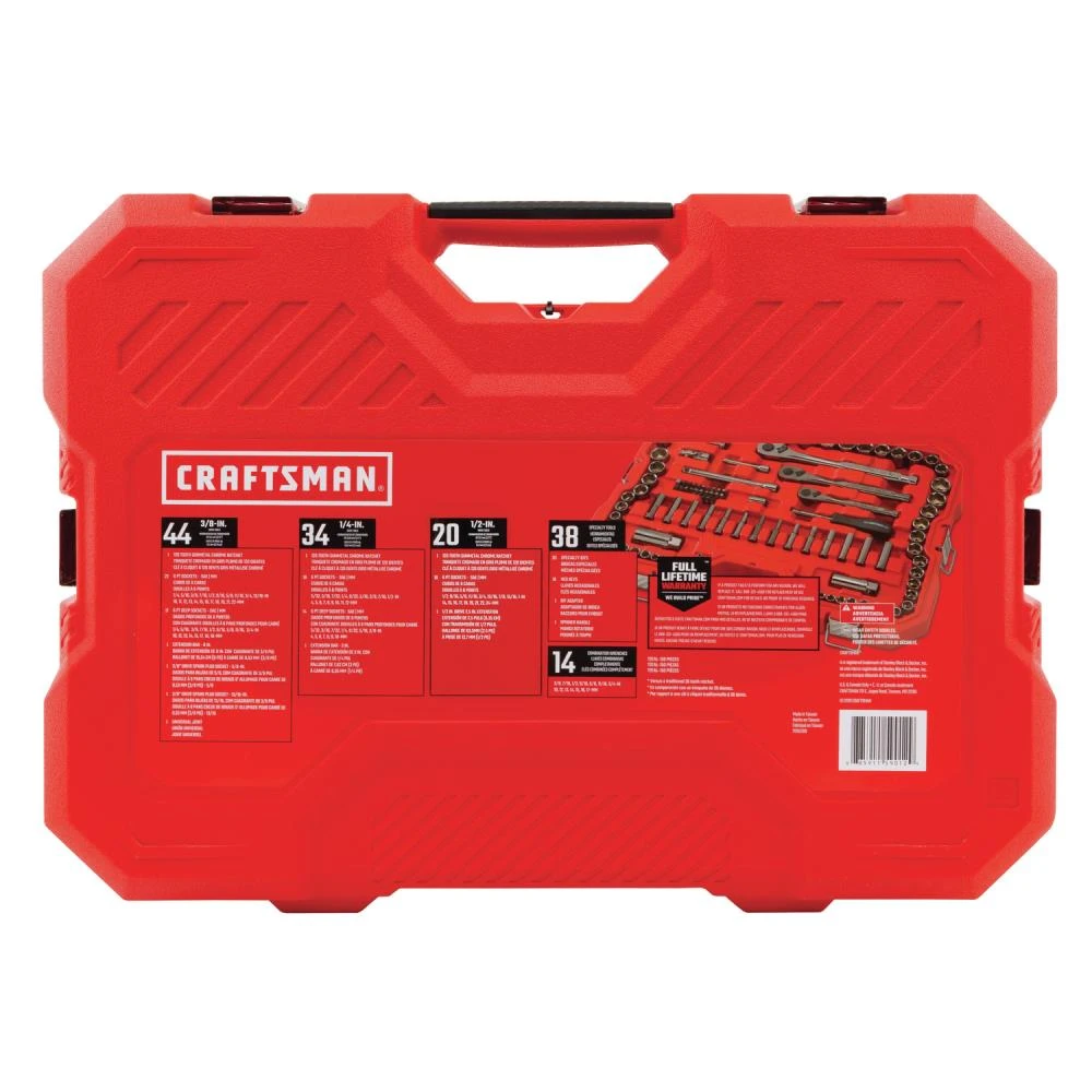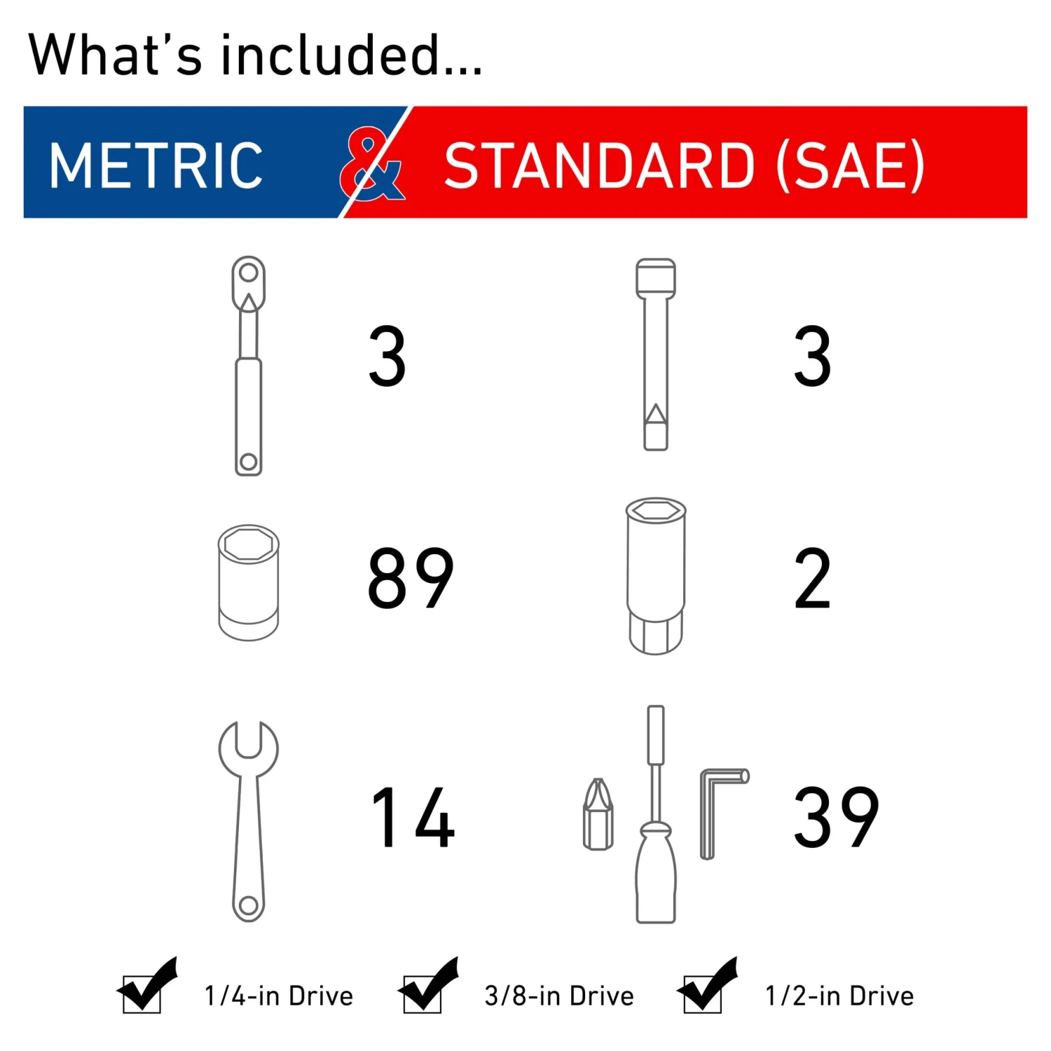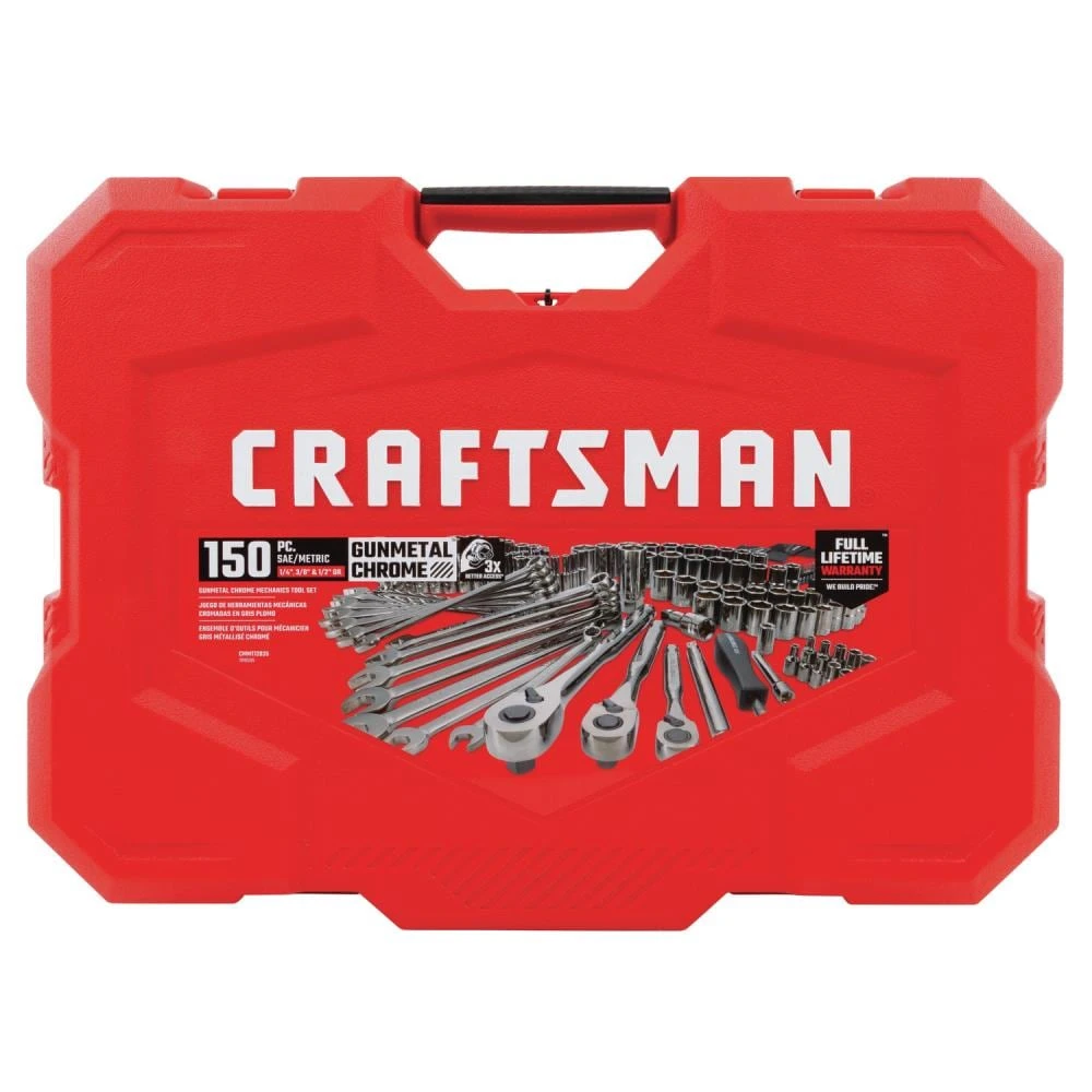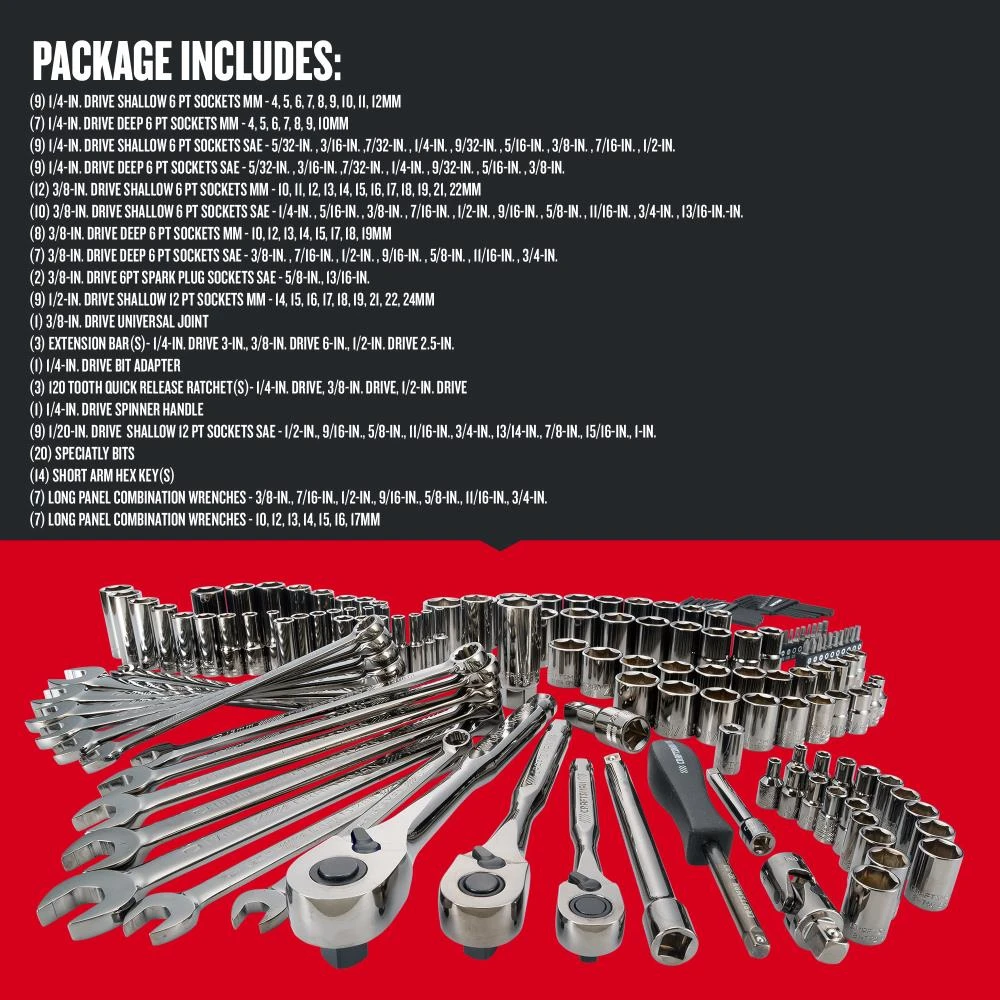 150 pc Gunmetal Chrome Mechanics Tool Set is made for the auto-enthusiast, semi-pro, or do-it-yourselfer. This set comes with the new industry-leading, 120-Tooth ratchet that provides maximum accessibility in tight spots. With its slim head and 3° arc swing, you can get into narrow spaces with ease and quickly tighten or loosen a fastener. Take on your next project with our Gunmetal Chrome 150 pc mechanics tool set. 150 pc set includes: (9) 1/4-in Drive Shallow 6 PT Sockets SAE (5/32, 3/16, 7/32, 1/4, 9/32, 5/16, 3/8, 7/16, 1/2-in), (9) 1/4-in Drive Shallow 6 PT Sockets Metric (4, 5, 6, 7, 8, 9, 10, 11, 12mm), (9) 1/4-in Drive Deep 6 PT Sockets SAE (5/32, 3/16, 7/32, 1/4, 9/32, 5/16, 3/8-in), (7) 1/4-in Drive Deep 6 PT Sockets Metric (4, 5, 6, 7, 8, 9, 10mm), (10) 3/8-in Drive Shallow 6 PT Sockets SAE (1/4, 5/16, 3/8, 7/16, 1/2, 9/16, 5/8, 11/16, 3/4, 13/16-in), (12) 3/8-in Drive Shallow 6 PT Sockets Metric (10, 11, 12, 13, 14, 15, 16, 17, 18, 19, 21, 22mm), (7) 3/8-in Drive Deep 6 PT Sockets SAE (3/8, 7/16, 1/2, 9/16, 5/8, 11/16, 3/4-in), (8) 3/8-in Drive Deep 6 PT Sockets Metric (10, 12, 13, 14, 15, 17, 18, 19mm), (9) 1/2-in Drive Shallow 12 PT Sockets SAE (1/2, 9/16, 5/8, 11/16, 3/4, 13/16, 7/8, 15/16, 1-in), (9) 1/2-in Drive Shallow 12 PT Sockets Metric (14, 15, 16, 17, 18, 19, 21, 22, 24mm), (7) SAE Combination Wrenches (3/8, 7/16, 1/2, 9/16, 5/8, 11/16, 3/4-in), (7) Metric Combination Wrenches (10, 12, 13, 14, 15, 16, 17mm), (2) 3/8-in Drive Spark Plug Sockets (5/8-in, 13/16-in), (1) 1/4-in Drive Bit Adapter, (1) 3/8-in Drive Universal Joint, (1) 1/4-in Drive Ext Bar (3-in), (1) 3/8-in Drive Ext bar (6-in), (1) 1/2-in Drive Ext bar (2-1/2-in), (1) 1/2-in Drive Ratchet 120T, (1) 3/8-in Drive Ratchet 120T, (1) 1/4-in Drive Ratchet 120T, (1) 1/4-in Spinner Handle, (16) Hex Keys and (20) Specialty Bits.