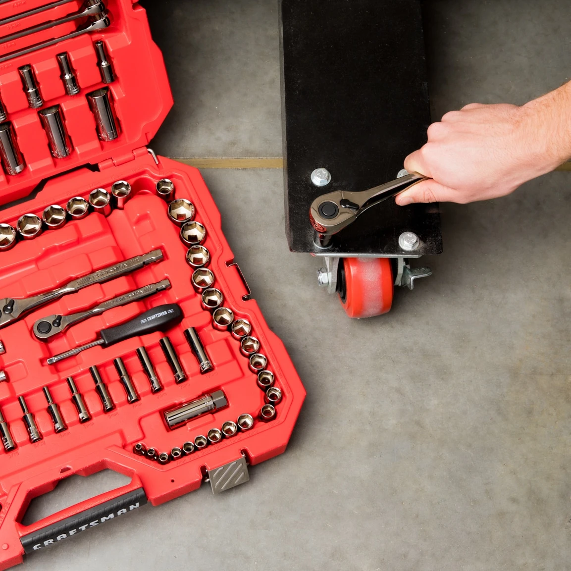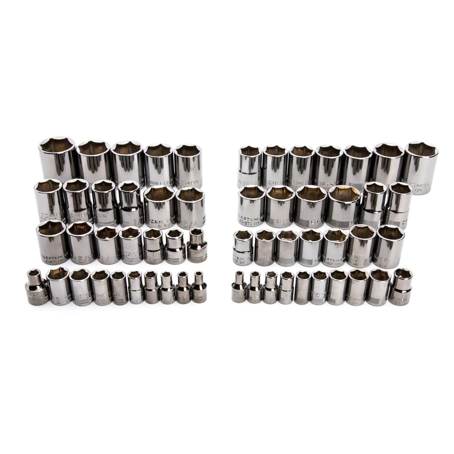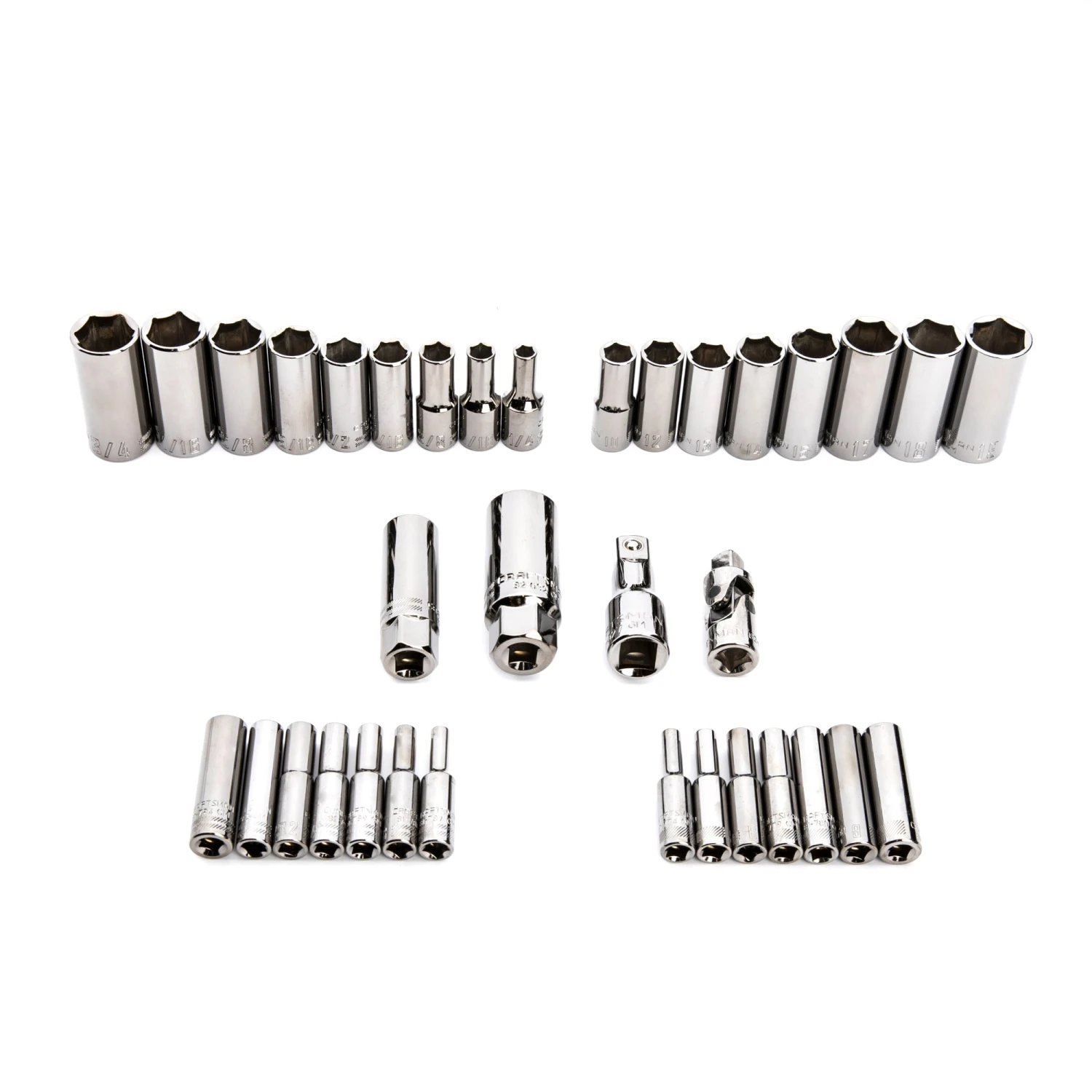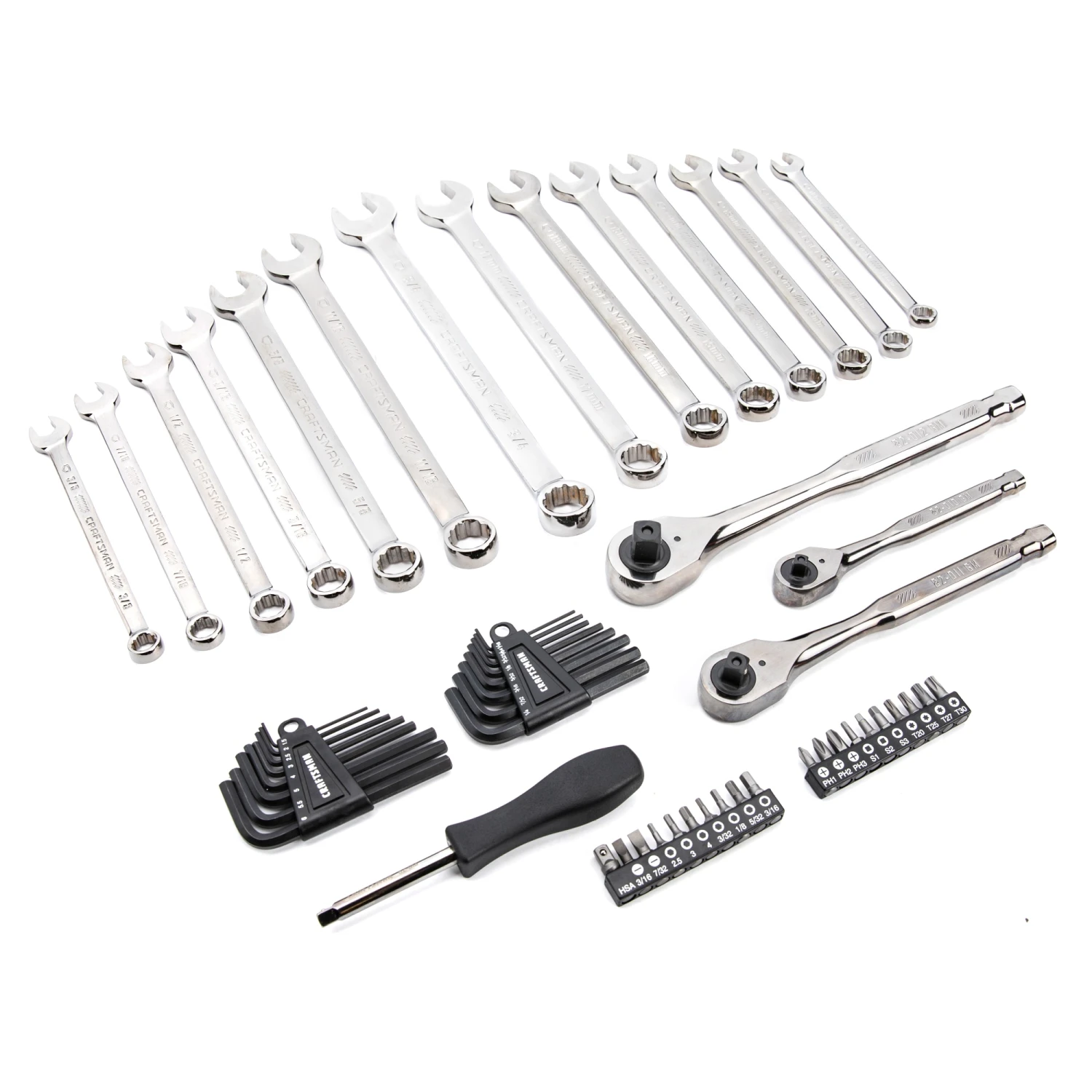 150 pc Gunmetal Chrome Mechanics Tool Set is made for the auto-enthusiast, semi-pro, or do-it-yourselfer. This set comes with the new industry-leading, 120-Tooth ratchet that provides maximum accessibility in tight spots. With its slim head and 3° arc swing, you can get into narrow spaces with ease and quickly tighten or loosen a fastener. Take on your next project with our Gunmetal Chrome 150 pc mechanics tool set. 150 pc set includes: (9) 1/4-in Drive Shallow 6 PT Sockets SAE (5/32, 3/16, 7/32, 1/4, 9/32, 5/16, 3/8, 7/16, 1/2-in), (9) 1/4-in Drive Shallow 6 PT Sockets Metric (4, 5, 6, 7, 8, 9, 10, 11, 12mm), (9) 1/4-in Drive Deep 6 PT Sockets SAE (5/32, 3/16, 7/32, 1/4, 9/32, 5/16, 3/8-in), (7) 1/4-in Drive Deep 6 PT Sockets Metric (4, 5, 6, 7, 8, 9, 10mm), (10) 3/8-in Drive Shallow 6 PT Sockets SAE (1/4, 5/16, 3/8, 7/16, 1/2, 9/16, 5/8, 11/16, 3/4, 13/16-in), (12) 3/8-in Drive Shallow 6 PT Sockets Metric (10, 11, 12, 13, 14, 15, 16, 17, 18, 19, 21, 22mm), (7) 3/8-in Drive Deep 6 PT Sockets SAE (3/8, 7/16, 1/2, 9/16, 5/8, 11/16, 3/4-in), (8) 3/8-in Drive Deep 6 PT Sockets Metric (10, 12, 13, 14, 15, 17, 18, 19mm), (9) 1/2-in Drive Shallow 12 PT Sockets SAE (1/2, 9/16, 5/8, 11/16, 3/4, 13/16, 7/8, 15/16, 1-in), (9) 1/2-in Drive Shallow 12 PT Sockets Metric (14, 15, 16, 17, 18, 19, 21, 22, 24mm), (7) SAE Combination Wrenches (3/8, 7/16, 1/2, 9/16, 5/8, 11/16, 3/4-in), (7) Metric Combination Wrenches (10, 12, 13, 14, 15, 16, 17mm), (2) 3/8-in Drive Spark Plug Sockets (5/8-in, 13/16-in), (1) 1/4-in Drive Bit Adapter, (1) 3/8-in Drive Universal Joint, (1) 1/4-in Drive Ext Bar (3-in), (1) 3/8-in Drive Ext bar (6-in), (1) 1/2-in Drive Ext bar (2-1/2-in), (1) 1/2-in Drive Ratchet 120T, (1) 3/8-in Drive Ratchet 120T, (1) 1/4-in Drive Ratchet 120T, (1) 1/4-in Spinner Handle, (16) Hex Keys and (20) Specialty Bits.