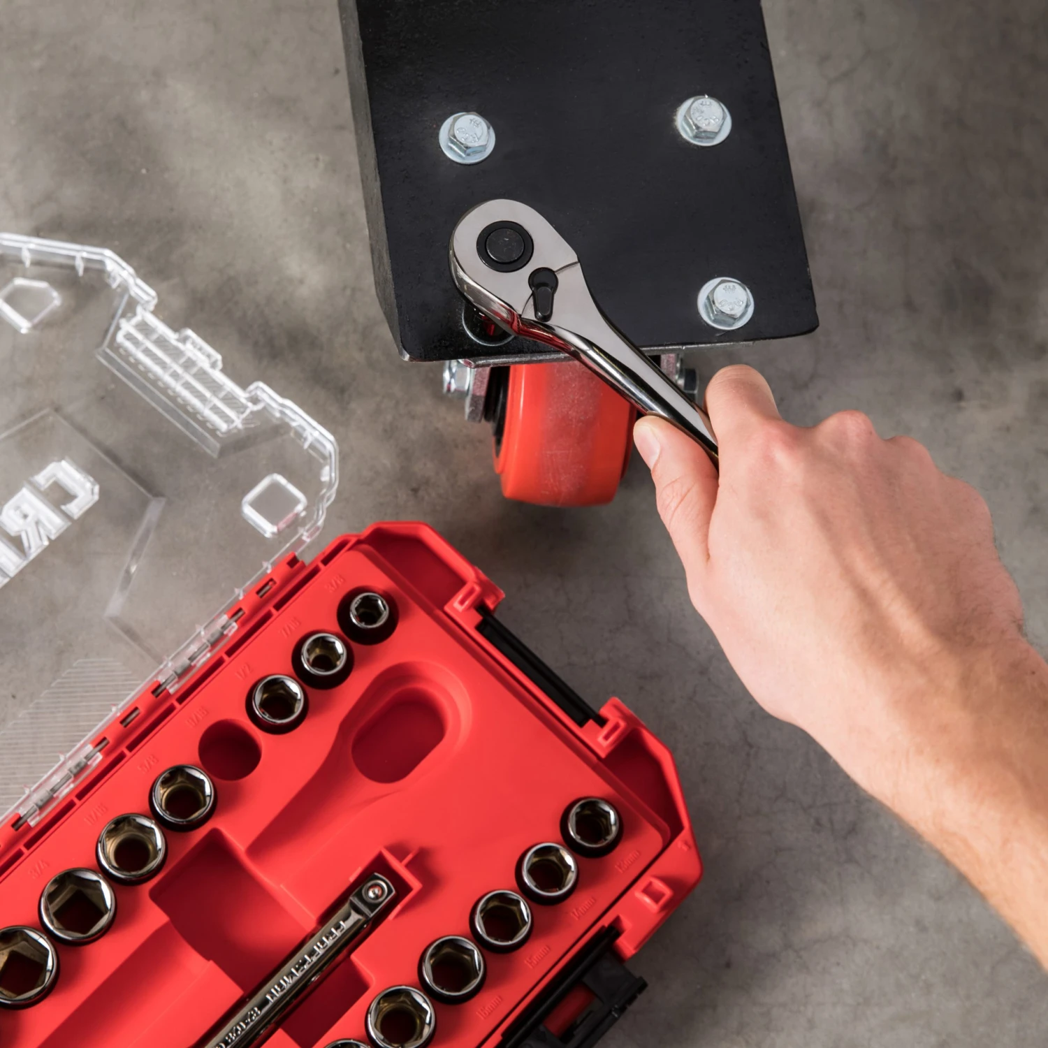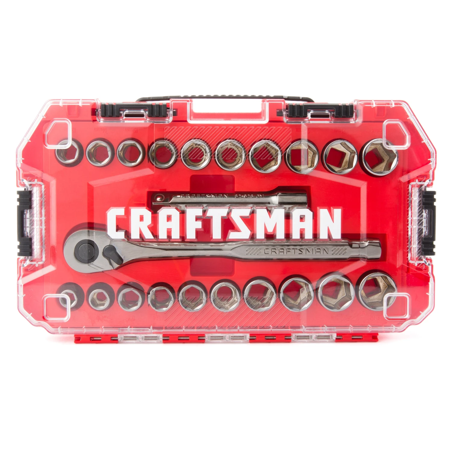 The 22 pc Gunmetal 1/2-in Drive Set comes equipped with a 120 Tooth ratchet and a broad assortment of sockets. This set is perfect for automotive repair, general construction, and DIY repairs. 22 pc set includes (10) 1/2-in Drive Shallow 6 PT Sockets SAE (3/8, 7/16, 1/2, 9/16, 5/8, 11/16, 3/4, 13/16, 7/8, 15/16-in), (9) 1/2-in Drive Shallow 6 PT Sockets Metric (14, 15, 16, 17, 18, 19, 20, 21, 22mm), (1) 120T 1/2-in Ratchet, (1) 1/2-in Drive Extension Bar (5-in) and (1) 1/2-in Drive Universal Joint.