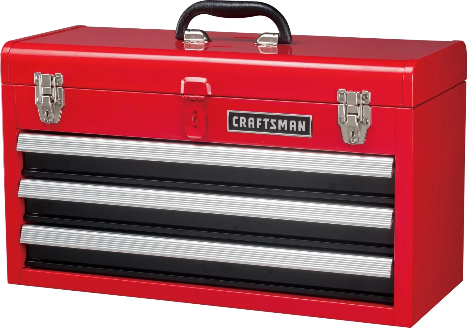 The CRAFTSMAN 3-drawer portable tool chest is exactly what you need to store your most-used hand tools in a durable steel chest that can easily be transported to your jobsite. Tools stay organized and easy to find in three shallow drawers and a deeper storage area under the lid. Heavy-duty steel construction. 25-Lb steel ball-bearing drawer slides. Padlock hasp and staple enable chest to be locked (padlock not included). Two metal latches secure the lid. Full-width metal hinge pin connects the lid to the chest. Comfort-grip top handle helps lift the chests. 1,512 Cubic inches of storage. Overall dimensions are 20.5-in W x 8.5-in D x 12-in H. 1 year limited manufacturer’s warranty.