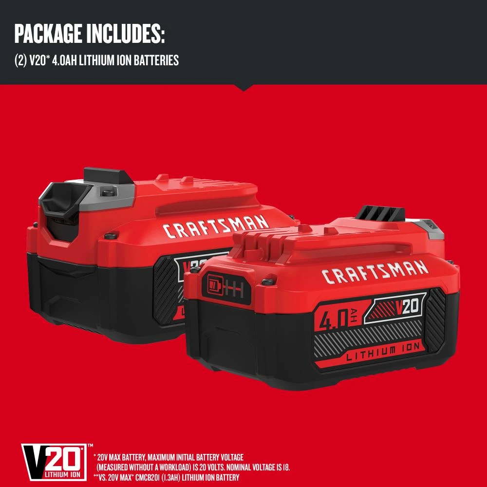 V20 4.0Ah Lithium Batteries (2 pack) were built for those take charge individuals. Made of two rows of premium grade cells and offers 3x longer run time of a standard V20 lithium battery. It is compatible with the CRAFTSMAN® V20 20V MAX cordless power tool and outdoor tool lineup.