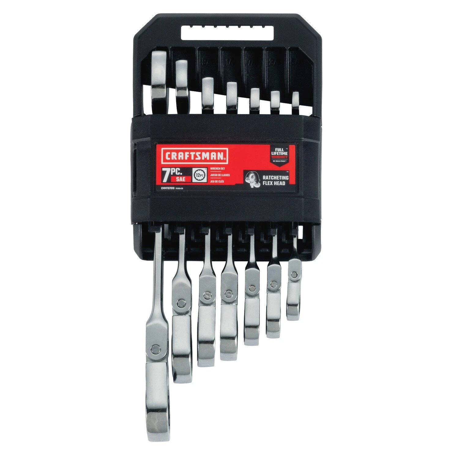 The CRAFTSMAN® 7-piece Standard (SAE) Flex head Ratcheting Wrench Set provides a versatile box end design. The Ratcheting head can flex 180 degree, which provides greater accessibility.