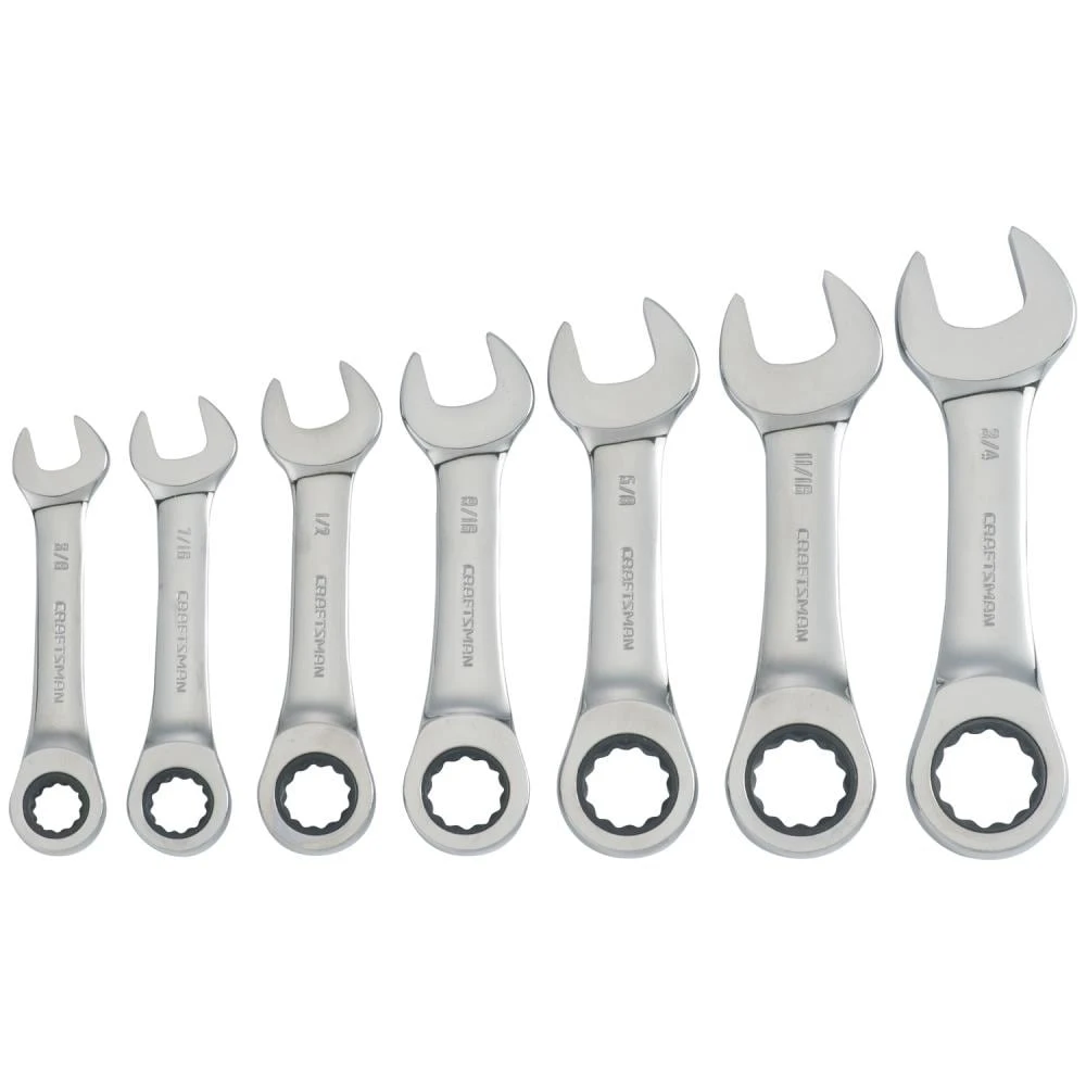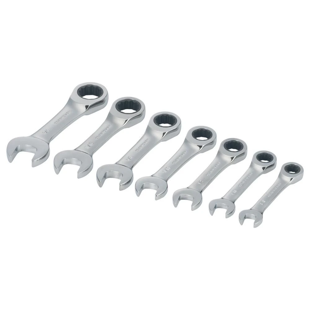 - Includes (7) Ratcheting Stubby Combination Wrenches SAE (3/8-in, 7/16-in, 1/2-in, 9/16-in, 5/8-in, 11/16-in, 3/4-in)