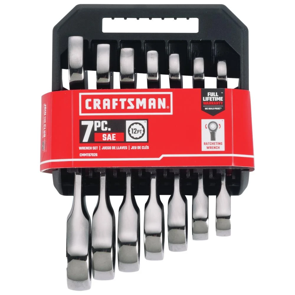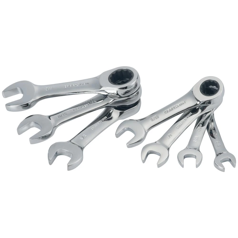 The CRAFTSMAN® 7-piece Standard (SAE) Stubby Ratcheting Combination Wrench Set offers a number of applications from the standard bolt turning to working on specific automotive repairs.