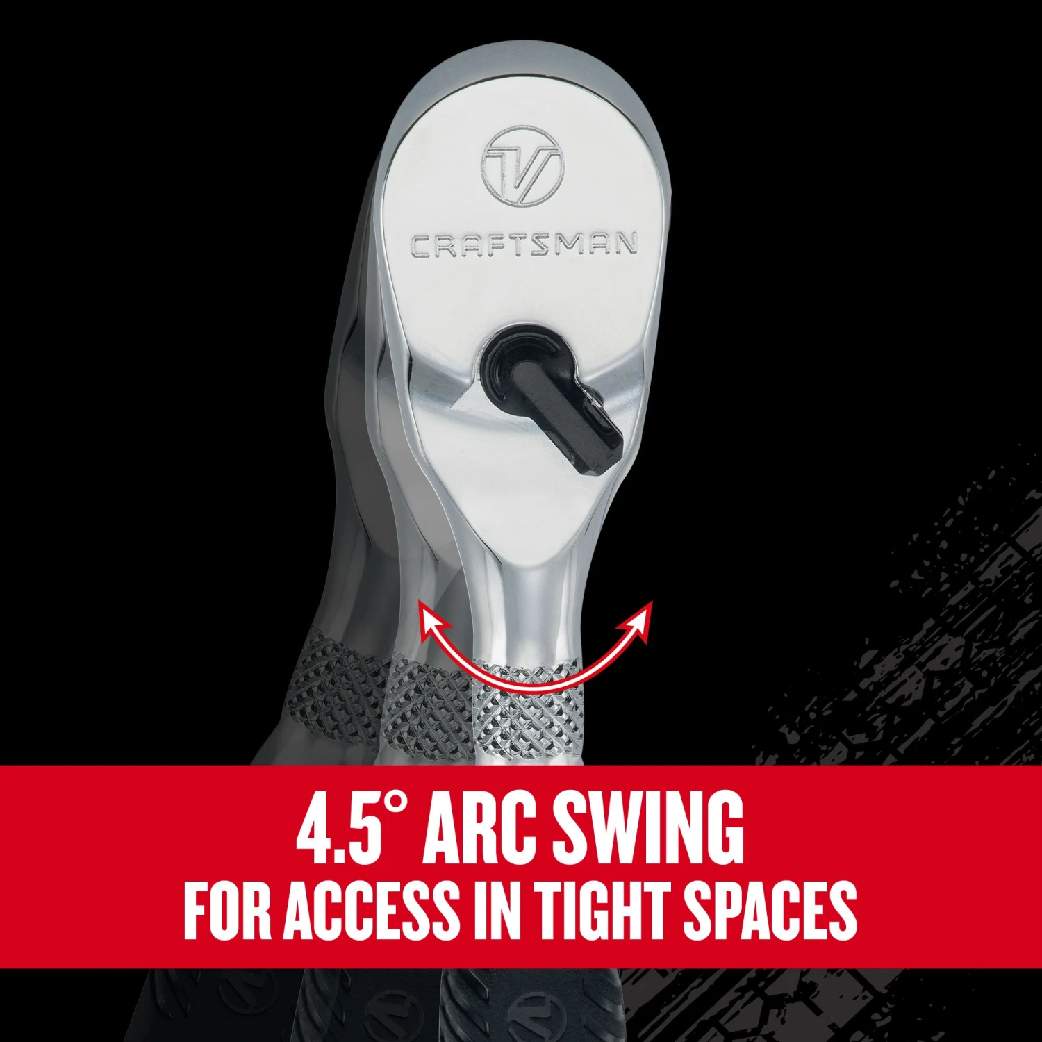 The V-Series 1/4-in Drive Comfort Grip Ratchet delivers unprecedented performance to the Craftsman brand. Engineered for professionals, this 1/-in Drive Comfort Grip Ratchet is constructed with a Precision Engineered Gear that provides users with improved tool life and durability. Its 80 tooth design produces a short 4.5 degree arc swing that enables users to access the tightest of spaces without sacrificing strength. Backed by Craftsman’s Lifetime Warranty, this product is designed to deliver the quality and durability expected from the Craftsman brand. If the product fails to perform for any reason, we will replace it. Return damaged product to a stocking Retail Partner or call 1-888-331-4569 for details. No proof of purchase required.