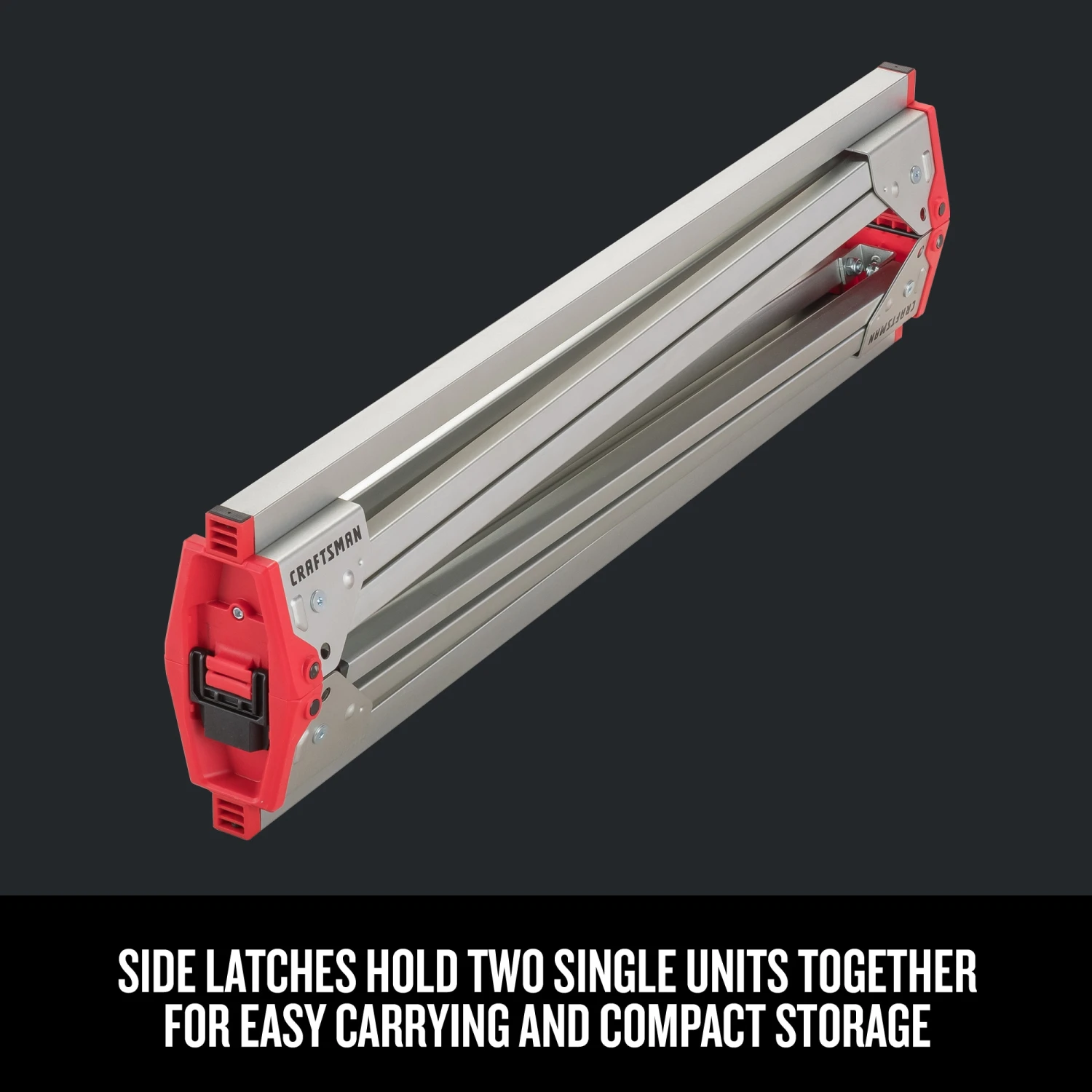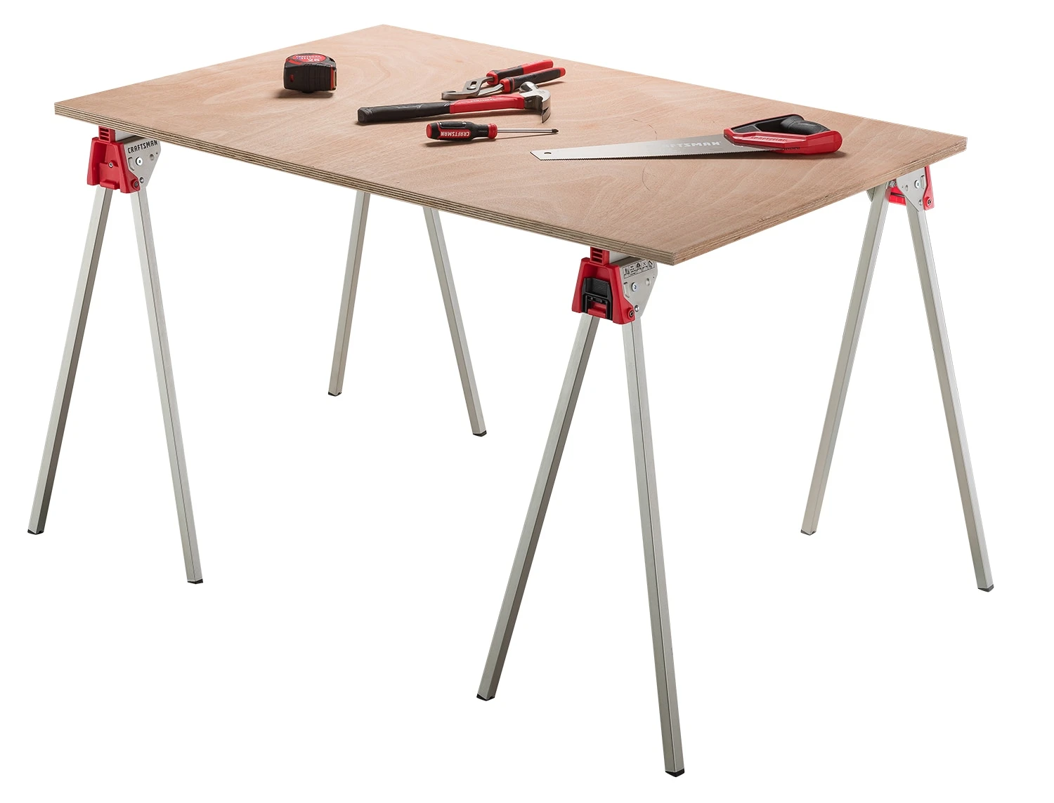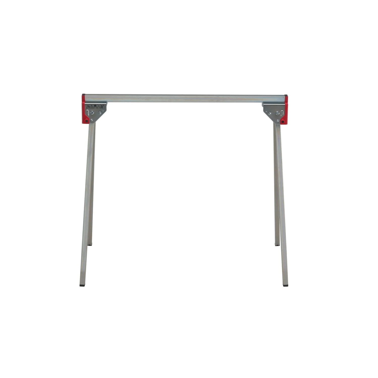 The Essential Metal Sawhorse has a sturdy, stable structure that can hold up to 1000-lbs when used as a pair. The upper metal bar enables direct clamping for a wide range of jobs. Anti-slip rubber pads create friction on the surface while cutting. Folding legs enable quick setup and breakdown. Side latches hold two single units together for easy carrying and compact storage.