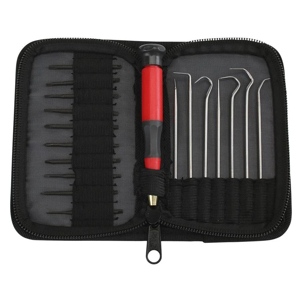 - Includes SL 3/64-in, SL 1/16-in, SL 5/64-in, SL 3/32-in, PH #000, PH #00, TX5, TX6, TX7, TX8 and 8 probes (35° bend, 90° bend, 180° loop straight, 180° hook, triple bend, double bend)