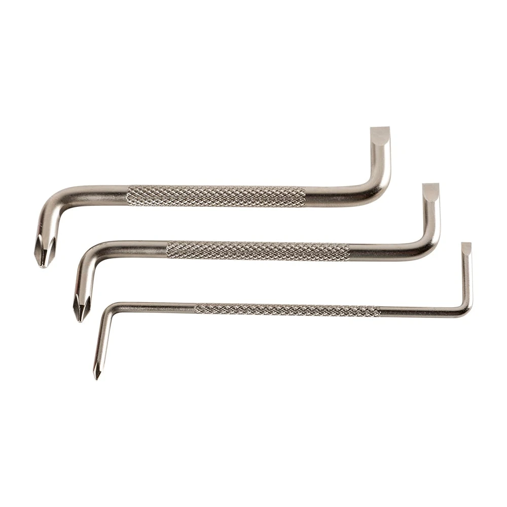 3 pc Offset Screwdriver Set features heat-treated, alloy steel blades for increased durability. A comfort optimized handle is ideal for high and low torque applications. Blades and shafts are coated with a satin-nickel finish to resist corrosion.