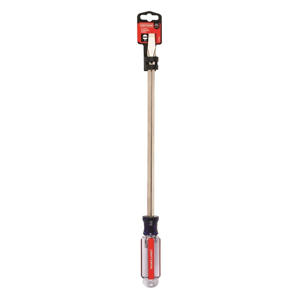3/8-in x 12-in Slotted Acetate Screwdriver with acetate handles feature heat-treated, alloy steel blades for increased durability. A comfort optimized handle is ideal for high and low torque applications. Blades and shafts are coated with a satin-nickel finish to resist corrosion.