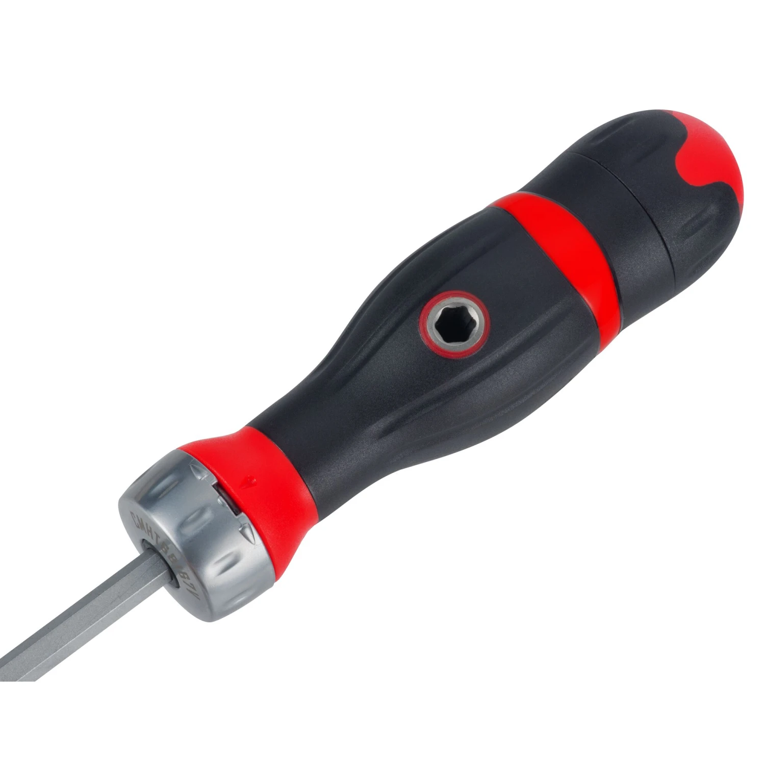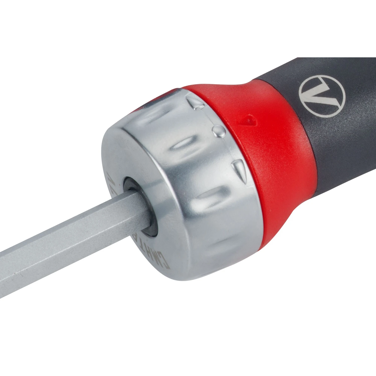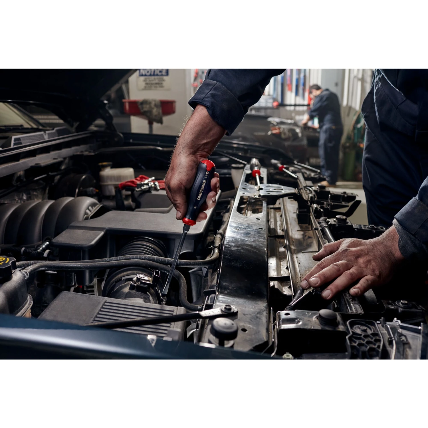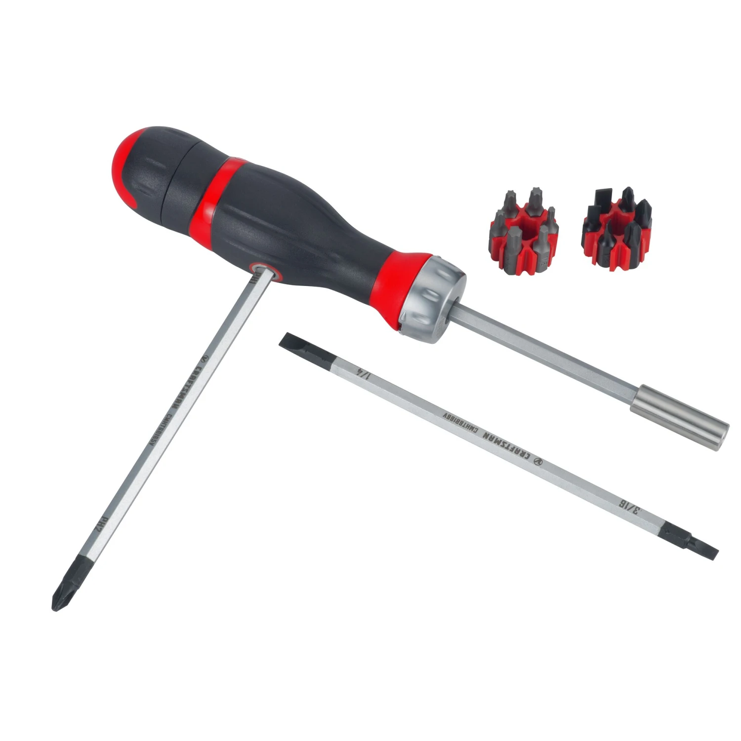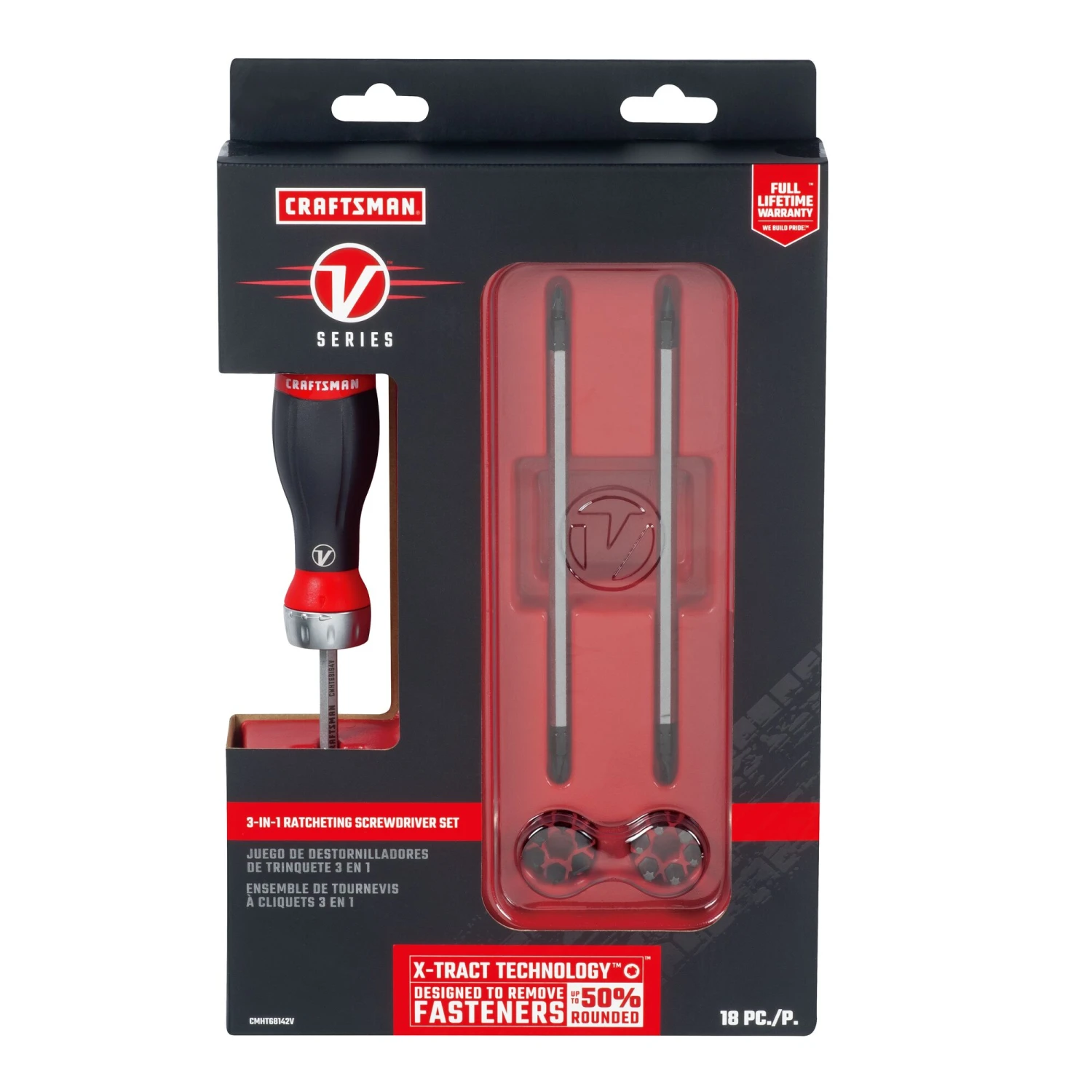 The Craftsman® V-Series 18pc 3-in-1 Ratcheting Screwdriver X-Tract™ Bit Set offers the multi-functionality of a standard ratcheting screwdriver, T-handle and stubby in one versatile design. Install a bit into the top port to use as a standard ratcheting screwdriver or in the side port for t-handle action when additional torque is required or unscrew the bottom cap and use as a stubby when access is limited. This set includes X-Tract™ bits designed to remove fasteners up to 50% rounded, while also helping to prevent rounding or stripping of new fasteners. All bits are manufactured from premium S2 steel for strength and durability. Up to 6 bits store conveniently in the handle.