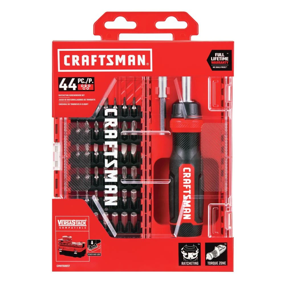 The CRAFTSMAN® 44-piece Ratcheting Screwdriver set with a VERSASTACK™ compatible case is the perfect solution to keep all your bits in one place ready to go for most projects. It’s magnetized bit holder can house insert or power bits for convienient replacement. Different zones on the handle allow you to focus on speed and precision or added grip texture for torque applications. The ratcheting action allows you to be quick and efficient by turning the driver without stopping to adjust wrist position.