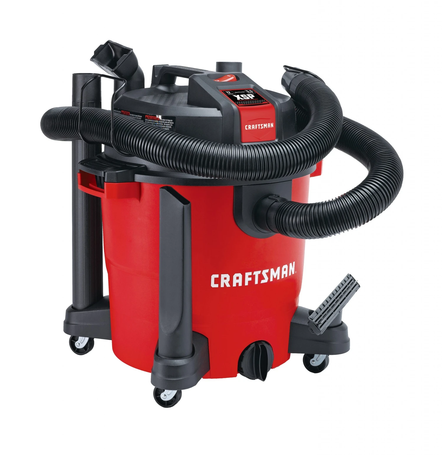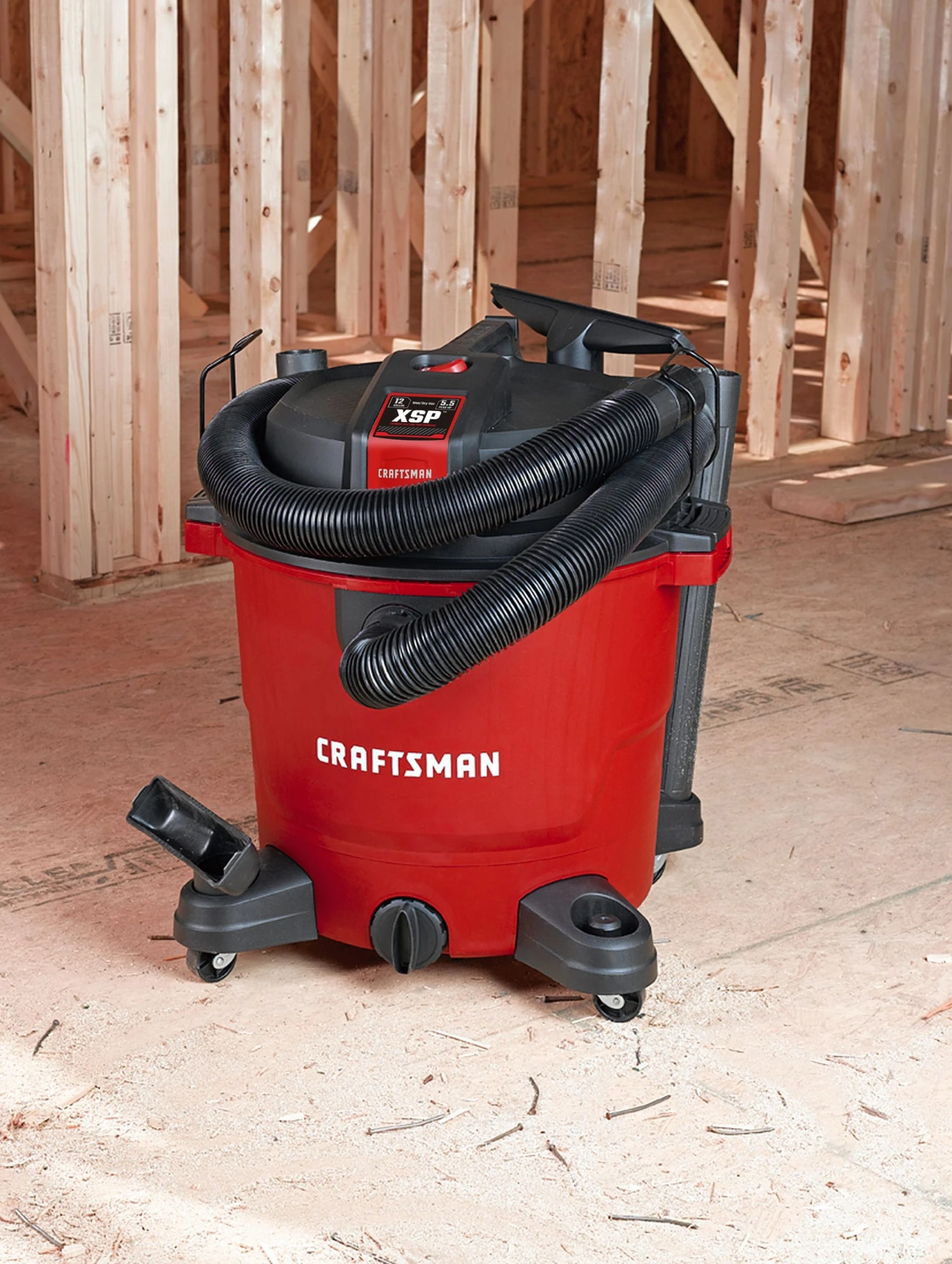 The full-size Craftsman 12-gallon wet/dry vacuum is designed to tackle the toughest projects that the home, shop, or jobsite can throw at you. The 12-gallon tank offers plenty of room for big messes and the high performance 5.5 peak HP† motor makes sure the tank gets filled, whether it’s with sawdust from the shop or debris from the jobsite. With its unique flat power head design, you have a place to conveniently store tools so they are easily accessible when needed. The on-board hose, power cord, and accessory storage allow you to keep all of your attachments organized and in one place. The wide-set casters and balanced top handle make for convenient transportation from one place to the next. This wet/dry vacuum comes standard with a wide array of accessories so you have the tools to get the job done no matter what. Turning this vacuum into a blower to remove debris from your yard or workspace could not be easier – all it takes is a simple conversion.