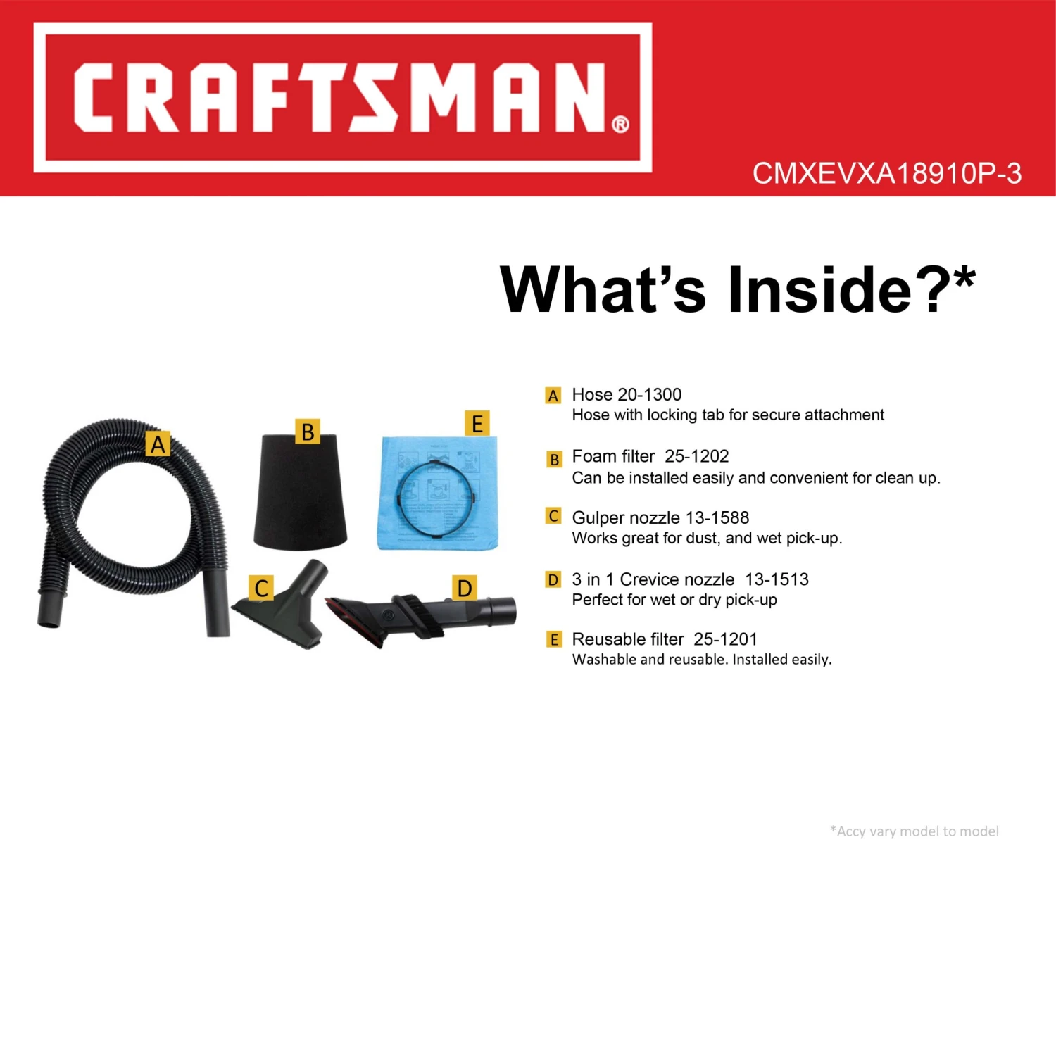 - Accessories include 1.25-in x 4-ft hose, 3-in-1 crevice nozzle, gulper nozzle, foam filter, reusable dry filter with clamp ring