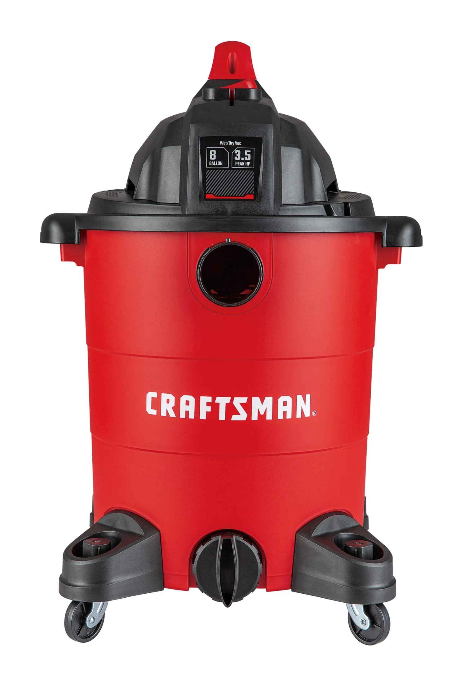 The Craftsman 8-gallon wet/dry vacuum can handle the toughest jobs around the house, garage, or shop. The 3.5 peak HP† motor makes cleanup easy, whether it’s dust collection in the shop or liquid spills at home. The balanced top handle design and durable, wide stance casters provide stable transportation during and after use. Turning this vacuum into a blower to remove debris from your yard or garage could not be easier – all it takes is a simple conversion.