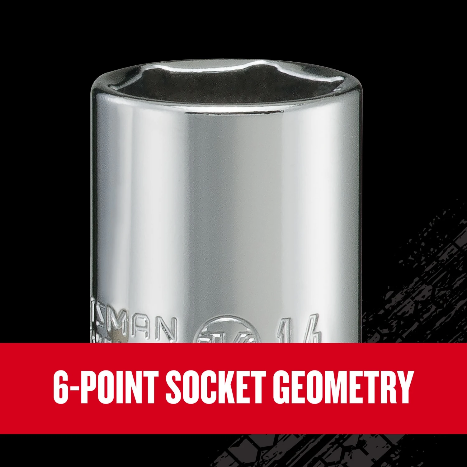 The V-Series 10PC. 1/4″ Drive Metric 6-Point Socket Set delivers unprecendented performance to the Craftsman brand. Engineered for professionals, this socket set features a magnetic socket rail for easy socket storage and organization. The sockets have premium features such as the 6-Point Socket Geometry that maximizes torque onto the flats of fasteners with an off-corner design. Other features include a chamfered and tapered tip design, which provides users with quicker socket-to-fastener engagement. Backed by Craftsman’s Lifetime Warranty, this product is designed to deliver the quality and durability expected from the Craftsman brand. If the product fails to perform for any reason, we will replace it. Return damaged product to a stocking Retail Partner or call 1-888-331-4569 for details. No proof of purchase required.
