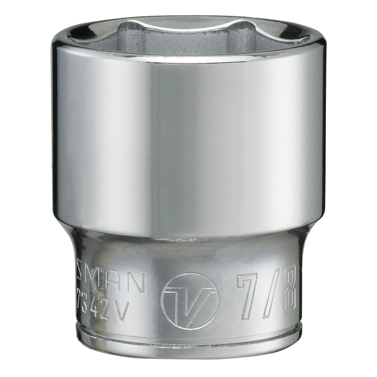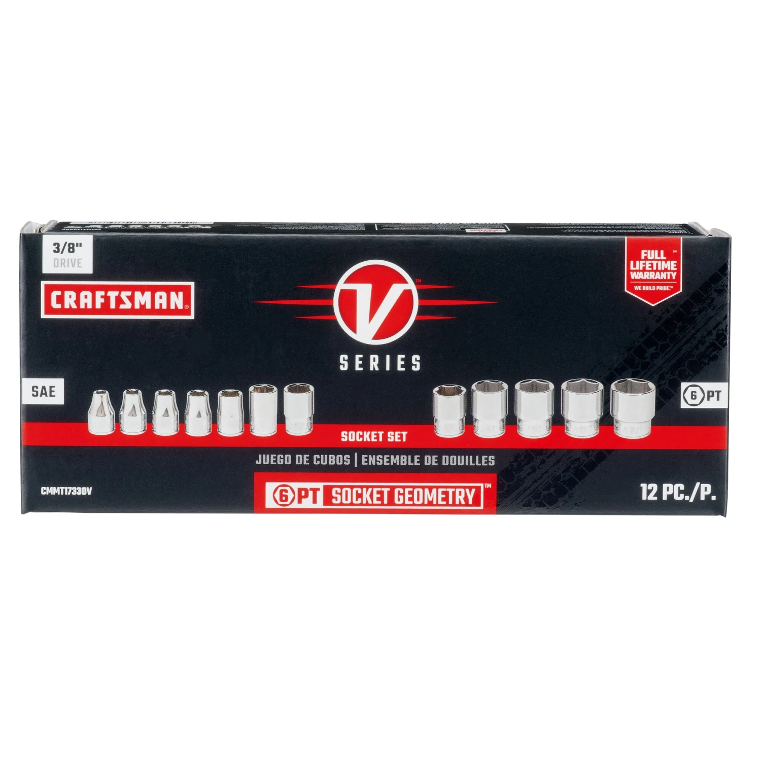 The V-Series 12PC. 3/8″ Drive SAE 6-Point Socket Set delivers unprecendented performance to the Craftsman brand. Engineered for professionals, this socket set features a magnetic socket rail for easy socket storage and organization. The sockets have premium features such as the 6-Point Socket Geometry that maximizes torque onto the flats of fasteners with an off-corner design. Other features include a chamfered and tapered tip design, which provides users with quicker socket-to-fastener engagement. Backed by Craftsman’s Lifetime Warranty, this product is designed to deliver the quality and durability expected from the Craftsman brand. If the product fails to perform for any reason, we will replace it. Return damaged product to a stocking Retail Partner or call 1-888-331-4569 for details. No proof of purchase required.