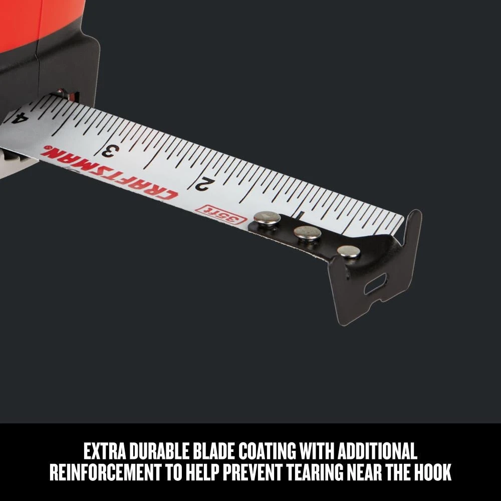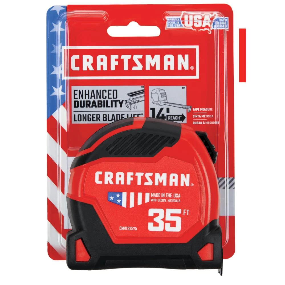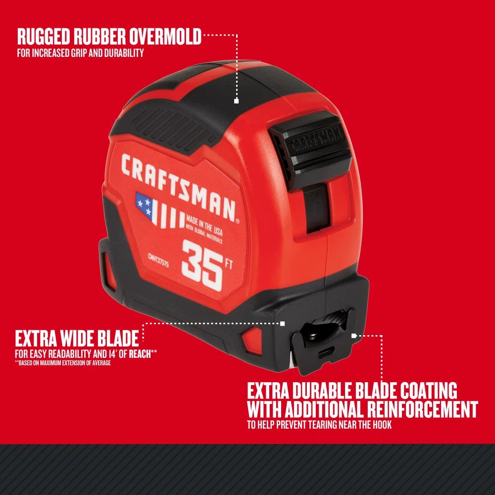 CRAFTSMAN® PROREACH tape measures are made in the USA with global materials and are designed to withstand daily jobsite abuse. With 14 feet of blade reach (based on maximum extension of average professional user) and new features designed to enhance the durability of the blade and provide a longer working life, the PROREACH tape measures provide a dependable solution no matter where your work takes you.