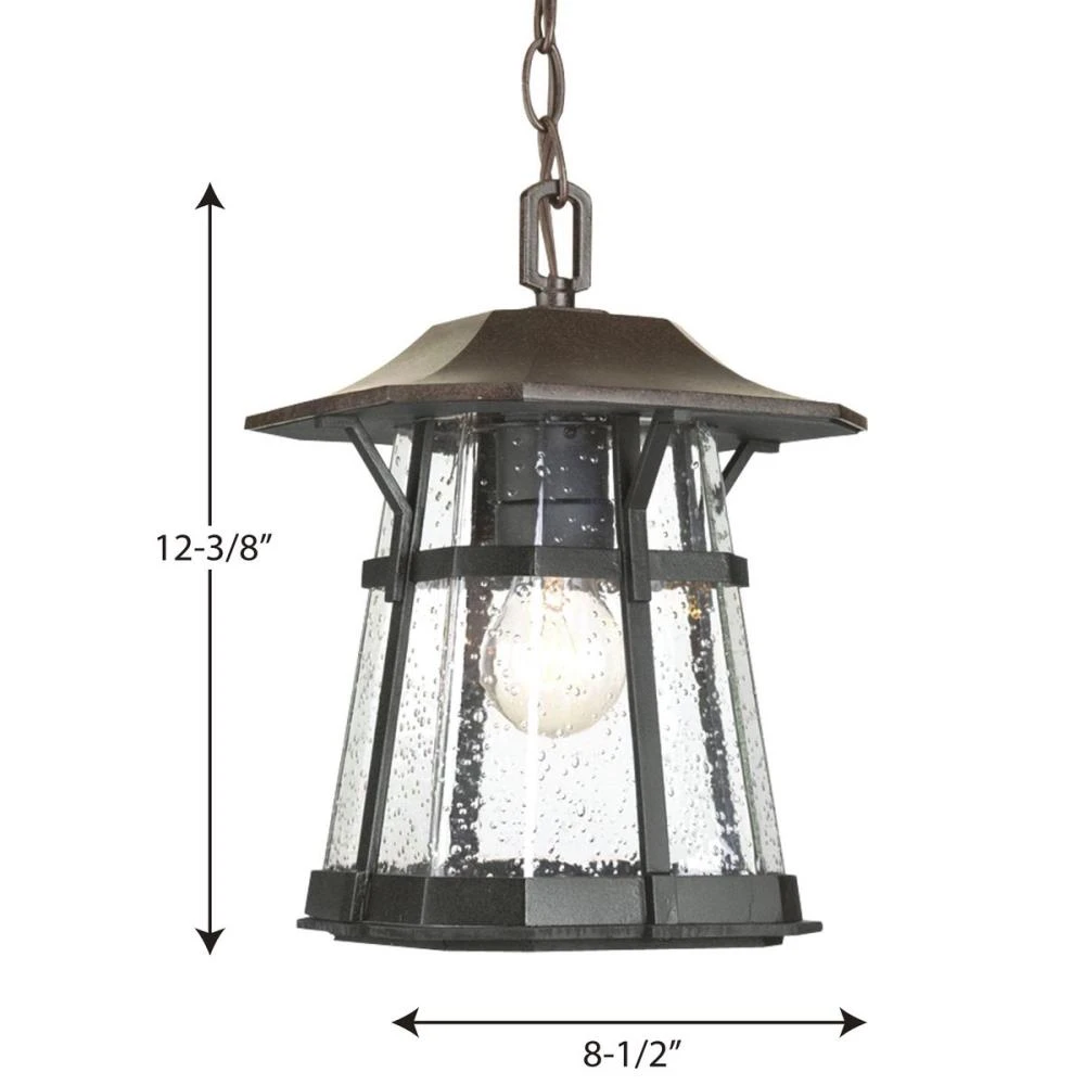 One-light hanging lantern from the Derby collection boasts a combination of espresso and textured black powder coated finishes. The seeded glass diffuser is encased in the cast aluminum black from with the espresso finish on the roof.